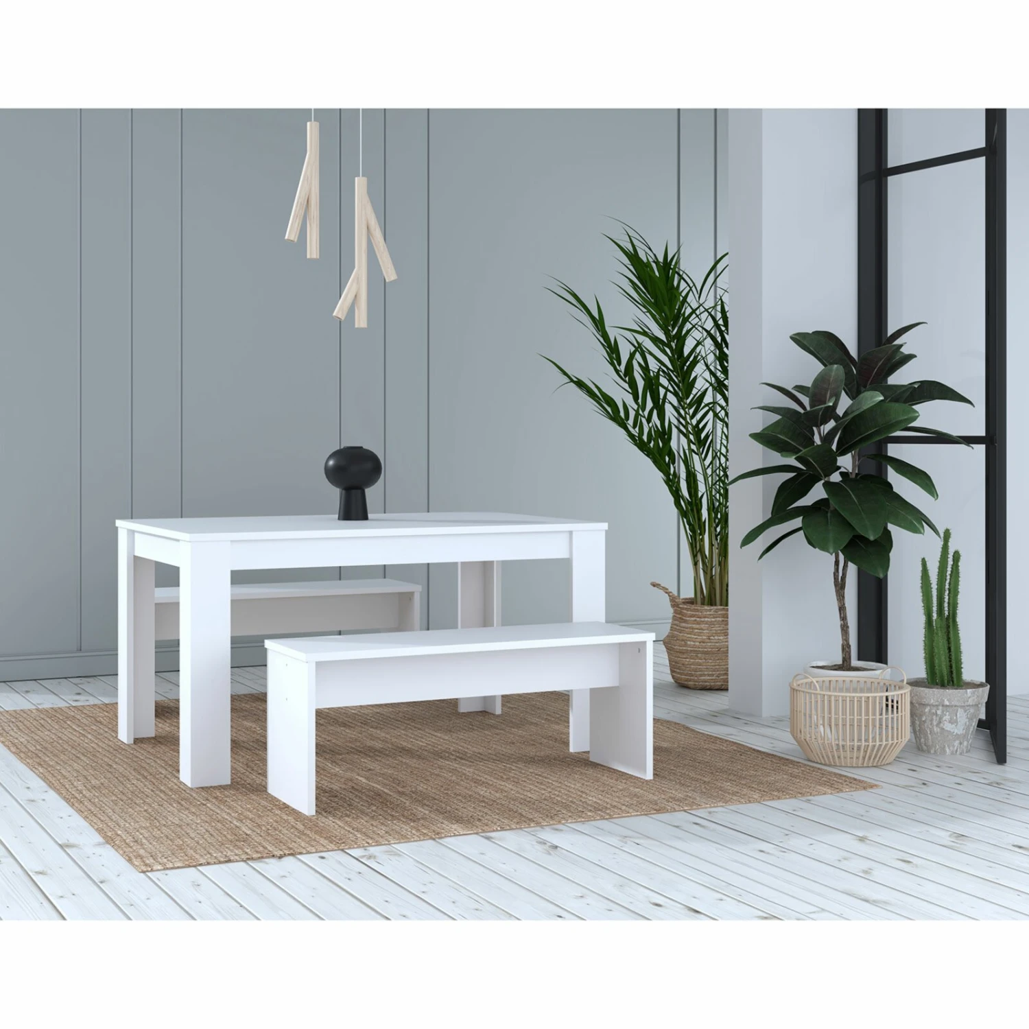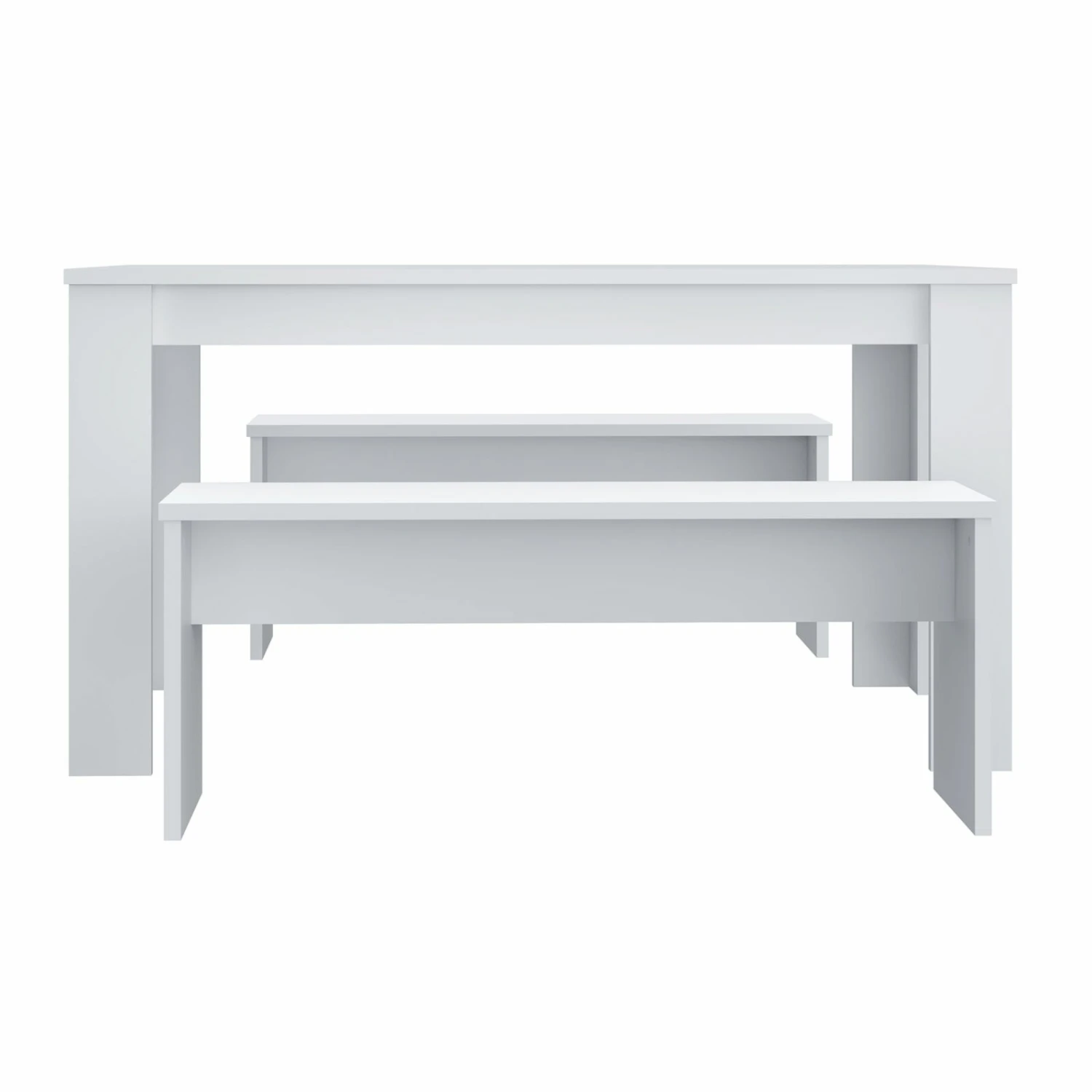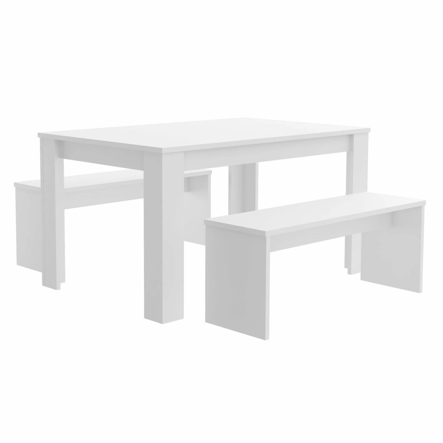 Diese Tischgruppe in schlichtem und modernem Weiß passt hervorragend in jedes Esszimmer. An einem Tisch und zwei Bänken findet die ganze Familie Platz. Machen Sie diese schöne dreiteilige Tischgruppe zu Ihrem neuen Treffpunkt der Familie.