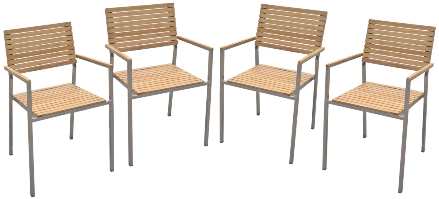 Modernes vierteiliges Set Stapelstühle aus Teak Massivholz und einem Edelstahl-Gestell, die mit vielen verschiedenen Gartenmöbeln harmonieren und jeden Außenbereich optisch aufwerten. Durch das Gestell und das Massivholz sind die Stühle sehr stabil und robust.