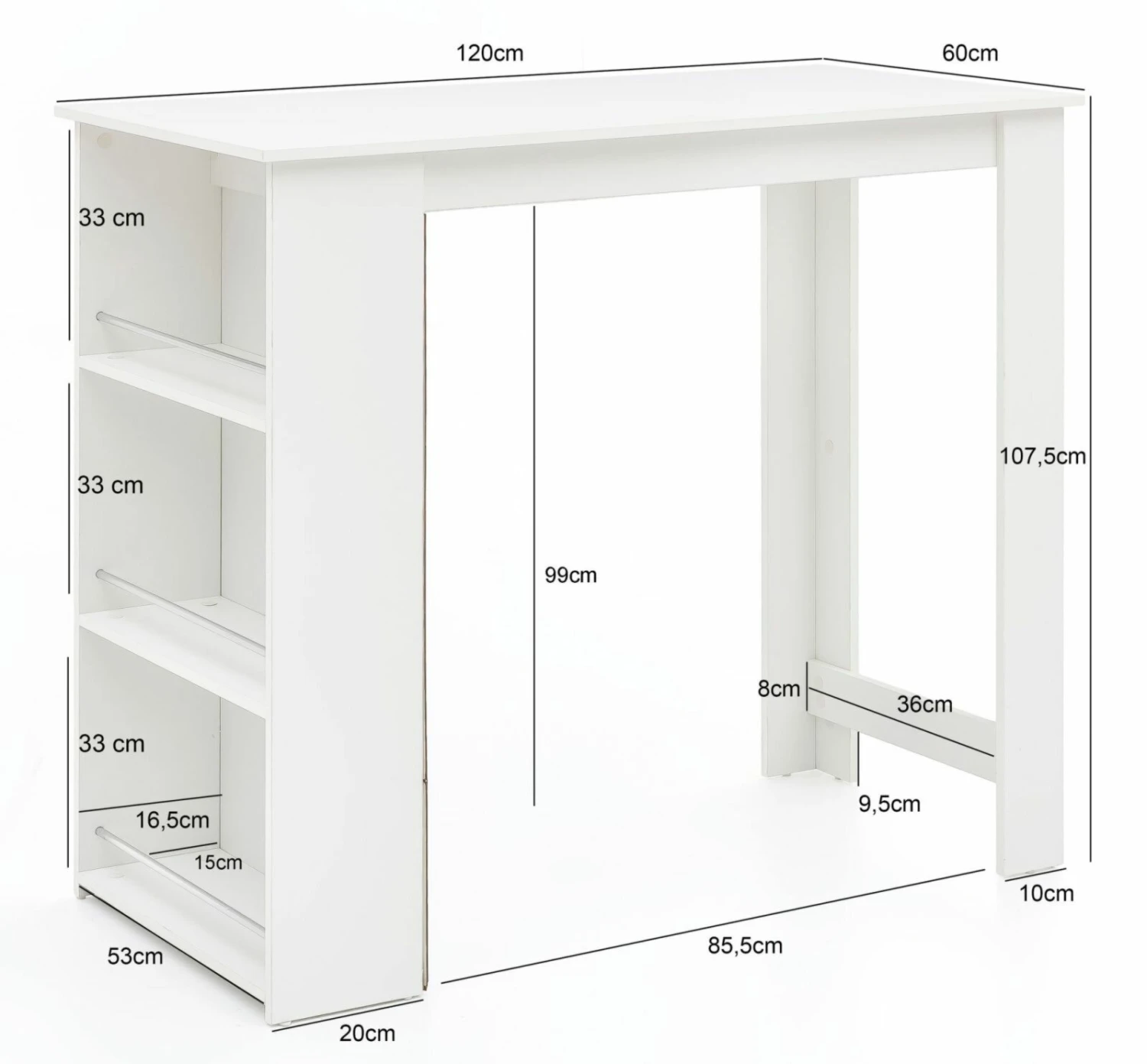 Dieser Bartisch wird dir und deinen Gästen den ein oder anderen Abend zu einem besonderen machen. Es gibt genügend Stauraummöglichkeiten für deine Utensilien, sodass du dich wie in einer Bar fühlen kannst. Der Tisch ist etwa 120 cm breit, 107 cm hoch und 60 cm tief.