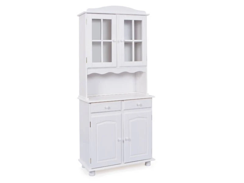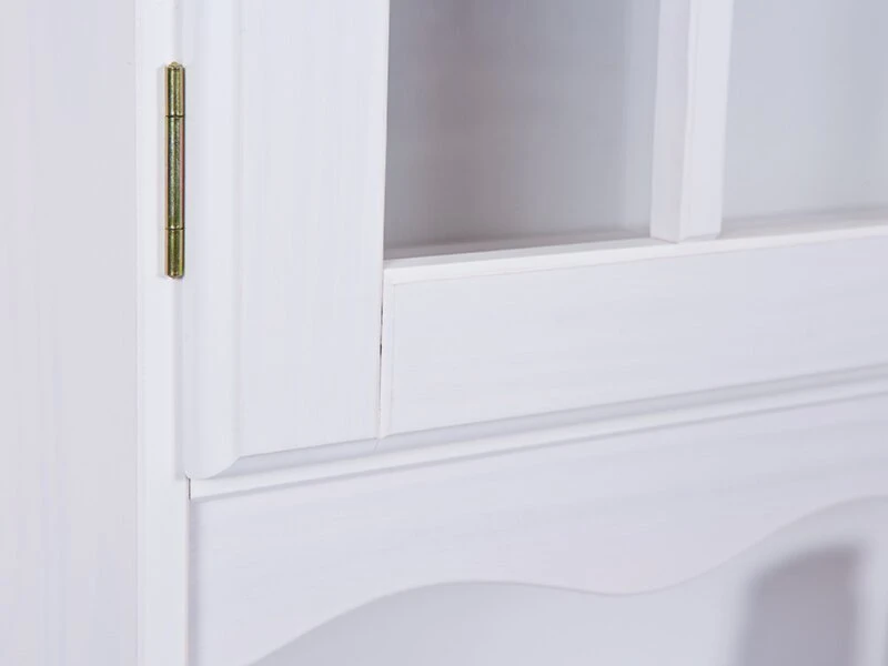 Diese wunderschöne Buffet-Vitrine ist im zeitlosen Landhausstil gehalten. Sie bietet reichlich Stauraum und optimale Präsentationsflächen zugleich. Hinter 4 Türen befinden sich Fachböden die zum Beispiel mit Geschirr oder sonstigen Küchenutensilien befüllt werden können. Setzen Sie Ihre Lieblingsstücke hinter den Glaselementen in Szene. Das Buffet besteht aus weiß lackiertem Kiefer-Massivholz. Die Maserungen des Kiefernholzes sind sichtbar, was den natürlichen Massivholzcharakter der Vitrine hervorhebt.