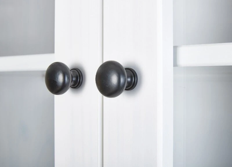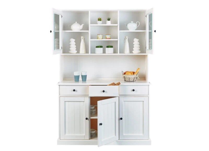 Ergänzen Sie Ihren Essbereich oder Ihre Küche mit zusätzlichem Stauraum. Dieses Buffet WESTERLAND 56.1 hilft Ihnen dabei. Sie können Ihre liebsten Stücke hinter zwei Glastüren präsentieren und gleichzeitig vor Staub schützen. Hinter den drei Drehtüren im unteren Bereich bietet sich viel Platz für Geschirr, Gläser und Schüsseln. Kleinigkeiten, wie Servietten oder Kerzen, finden in den Schubkästen ihren angestammten Raum. Alles was schnell zur Hand sein sollte, wie Gewürze oder Obst, können Sie in den offenen Fächern oder auf der Ablage platzieren. Das klassiche Weiß im Landhausstil wird optisch von schwarzen Griffen unterbrochen.