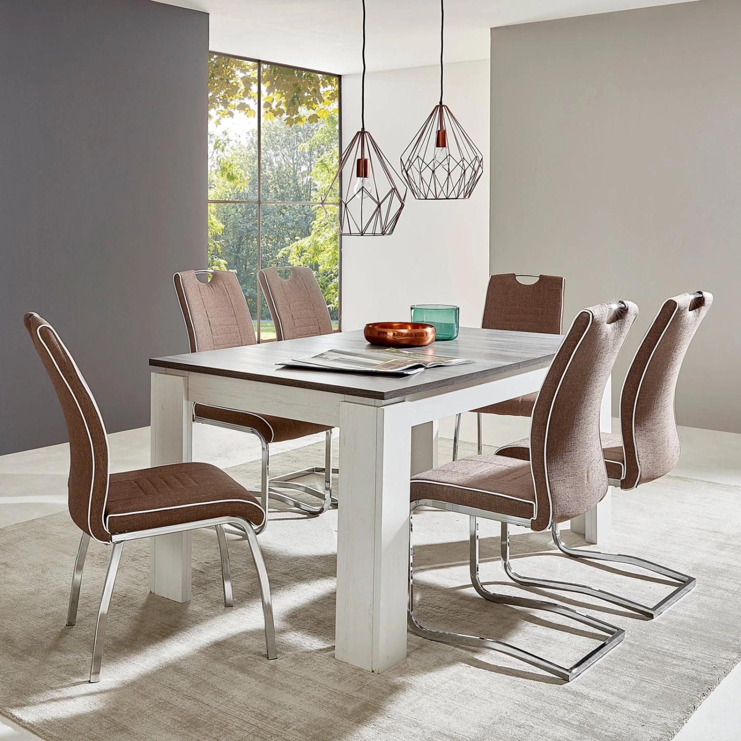 Der Schwingstuhl in Braun und Weiß ist ein außergewöhnlicher Blickfang. Er ist mit Webstoff bezogen und mit Kunstleder abgesetzt. Diese Materialkombination macht ihn zu einem besonderen Hingucker.