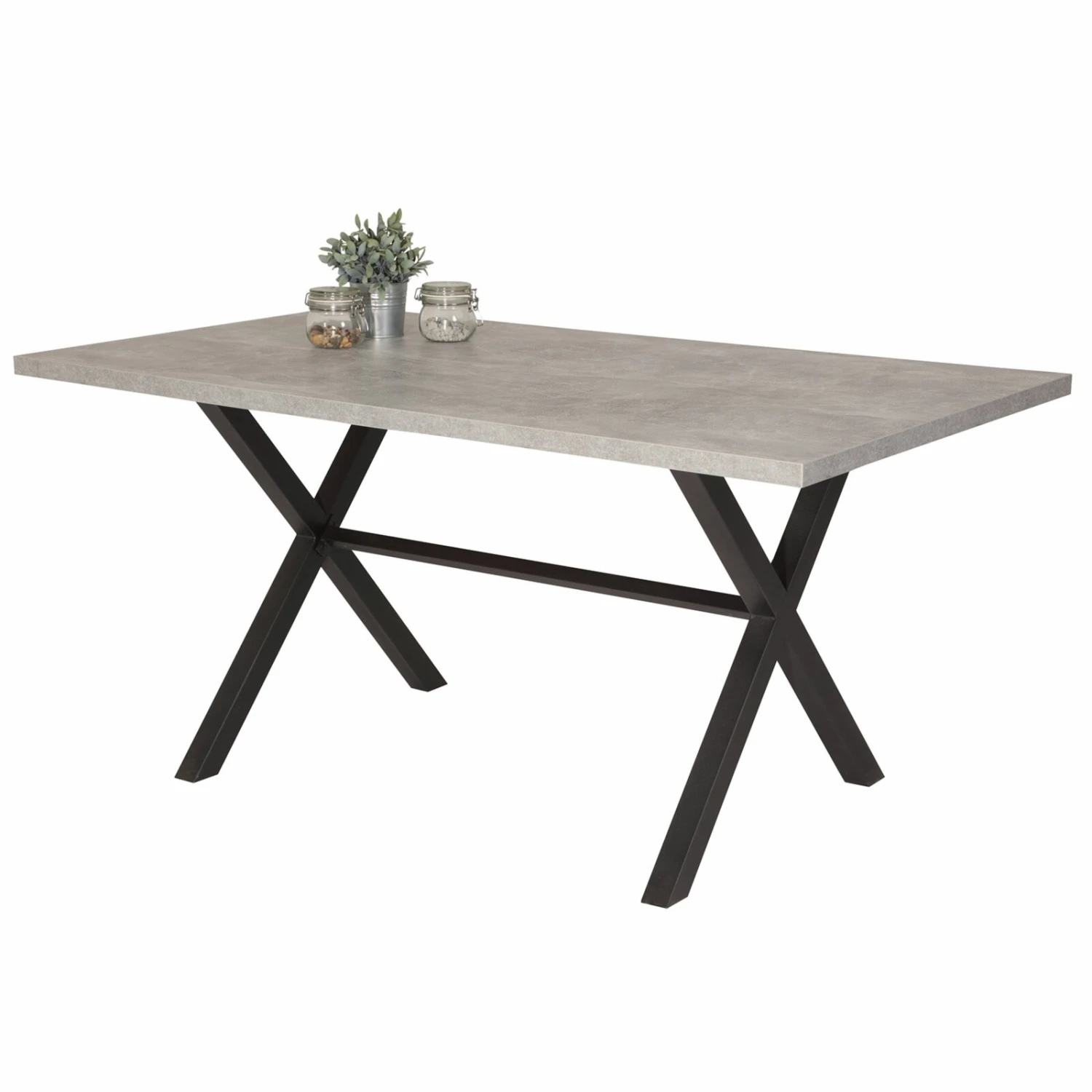 Exquisiter Esstisch in einer edlen Betonoptik, wo das Gestell nicht standardmäßig aussieht, denn der moderne Tisch ist mit einem anthrazitfarbenen X-Gestell verbaut worden.