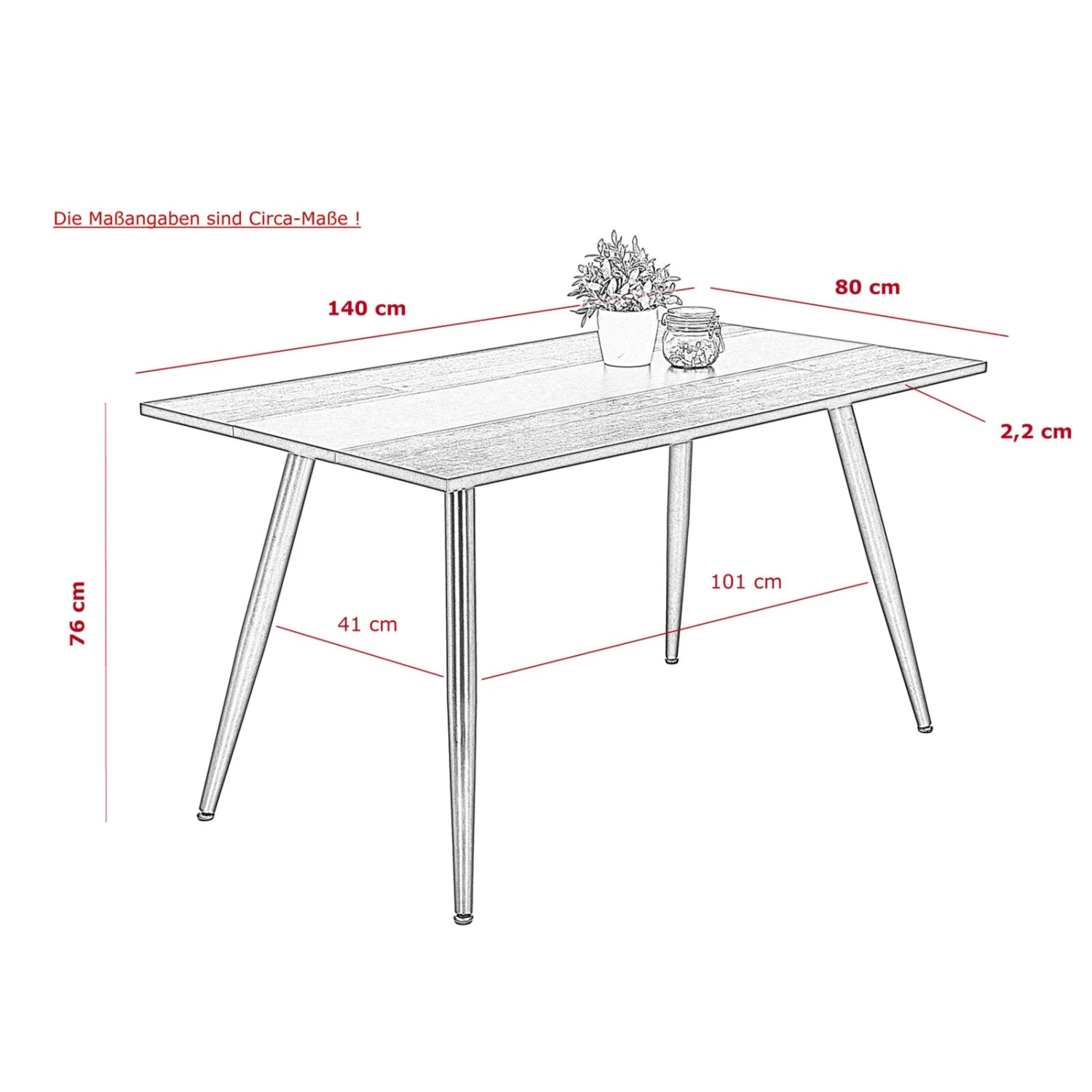 Genießen Sie Ihre Mahlzeiten an diesem etwa 140 x 80 cm großen Tisch. Die Tischplatte verfügt über einen Mittelstreifen in Schwarz, was einen ausgeprägten Kontrast schafft. Durch das schwarze Rundrohrgestell mit vier Beinen wird der stylische Eindruck abgerundet.