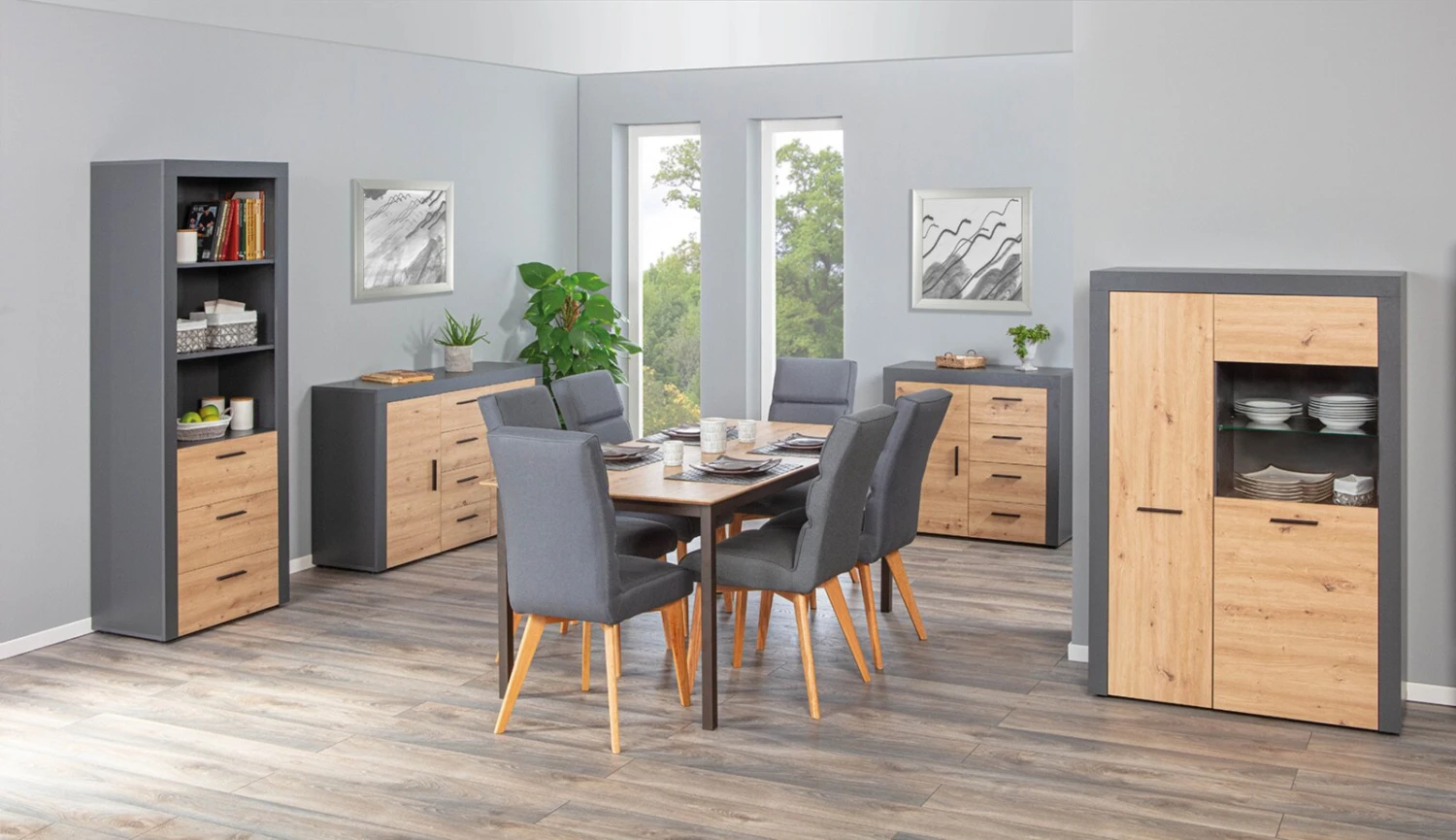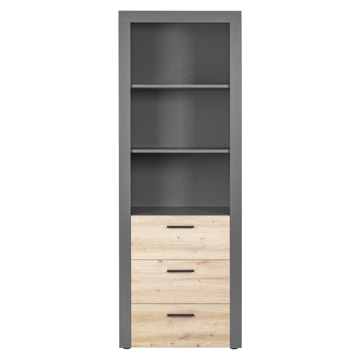 In trendigem Anthrazit gehalten kombiniert mit natürlich wirkender Artisan Eiche Nachbildung, bietet das moderne Standregal aus der CORBETO-Serie viel Platz zur Ausstellung Ihrer Preziosen. Dazu kommt noch einiges an Stauraum. In drei leichtläufigen Schubladen können Sie weitere Gegenstände unterbringen. Die Melaminbeschichtung sorgt dafür, dass die Möbeloberfläche pflegeleicht und robust ist. Gereinigt werden kann das Highboard einfach mit einem feuchten Tuch.