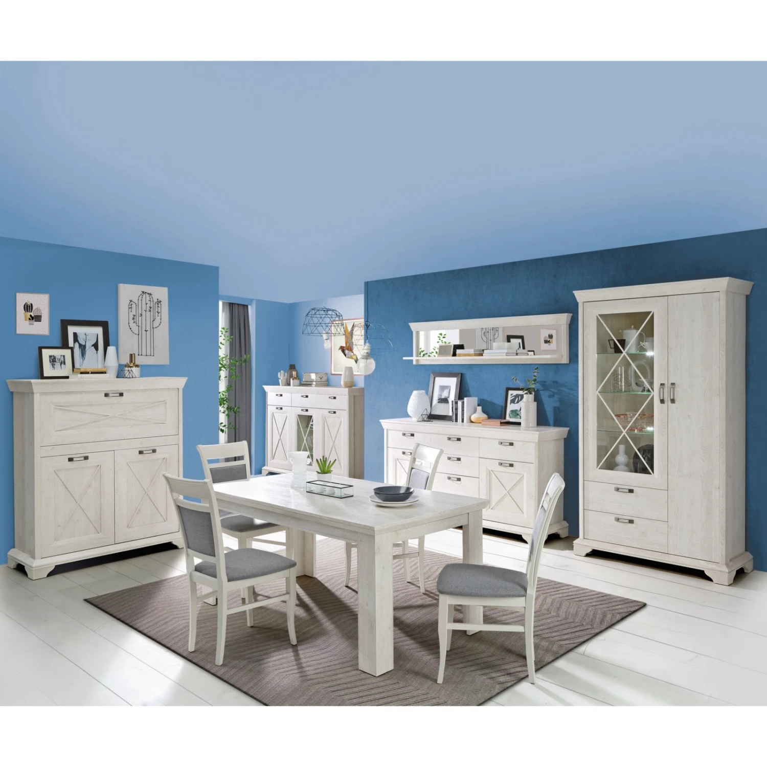 Das Highboard in Pinie weiß Nachbildung sorgt für Ordnung in Ihrem Esszimmer. Durch die drei Schubfächer und die beiden Türen ohne Glas, ist es ein echtes Platzwunder, indem Sie viel Geschirr, Besteck und Tischdecken verstauen können. Besondere Stücke können Sie in der Mitte in Szene setzen.