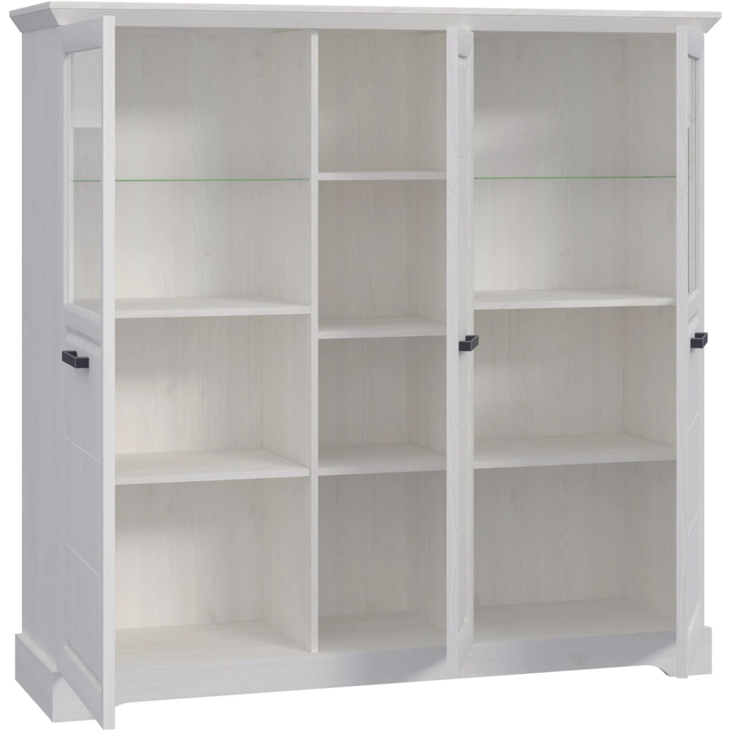 Bietet Ihnen viel Stauraum: das Highboard im traditionell interpretierten Landhausstil. Es ist ganz in Weiß gehalten und punktet mit der Sibiu-Lärche-Nachbildung. Die feine Maserung hebt sich dezent vom Hintergrund ab. Ein ansprechender Kontrast wird durch die Griffe in Schwarz gesetzt. Die beiden äußeren Türen sind mit Glaseinsätzen ausgestattet, hinter denen Sie auf den zwei Glasböden Bücher und Deko-Accessoires unterbringen können. Weitere Aufbewahrungsmöglichkeiten stehen Ihnen in den blickdichten Bereichen des Schranks zur Verfügung. Bei der Fertigung kommt Holzwerkstoff mit folierten Oberflächen zum Einsatz. Das Highboard mit insgesamt 12 Fächern besitzt die Maße BxHxT ca. 149,9 x 146,7 x 44,5 cm.
