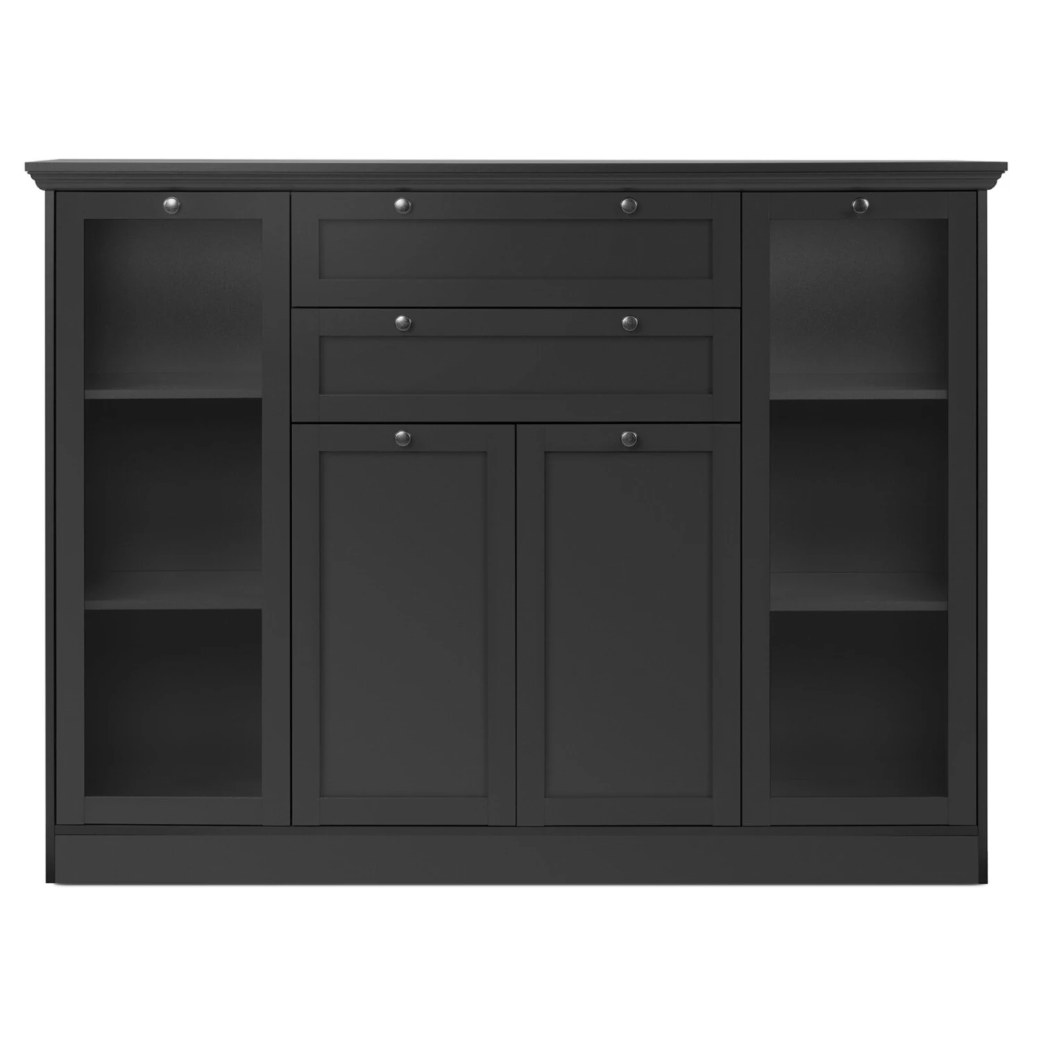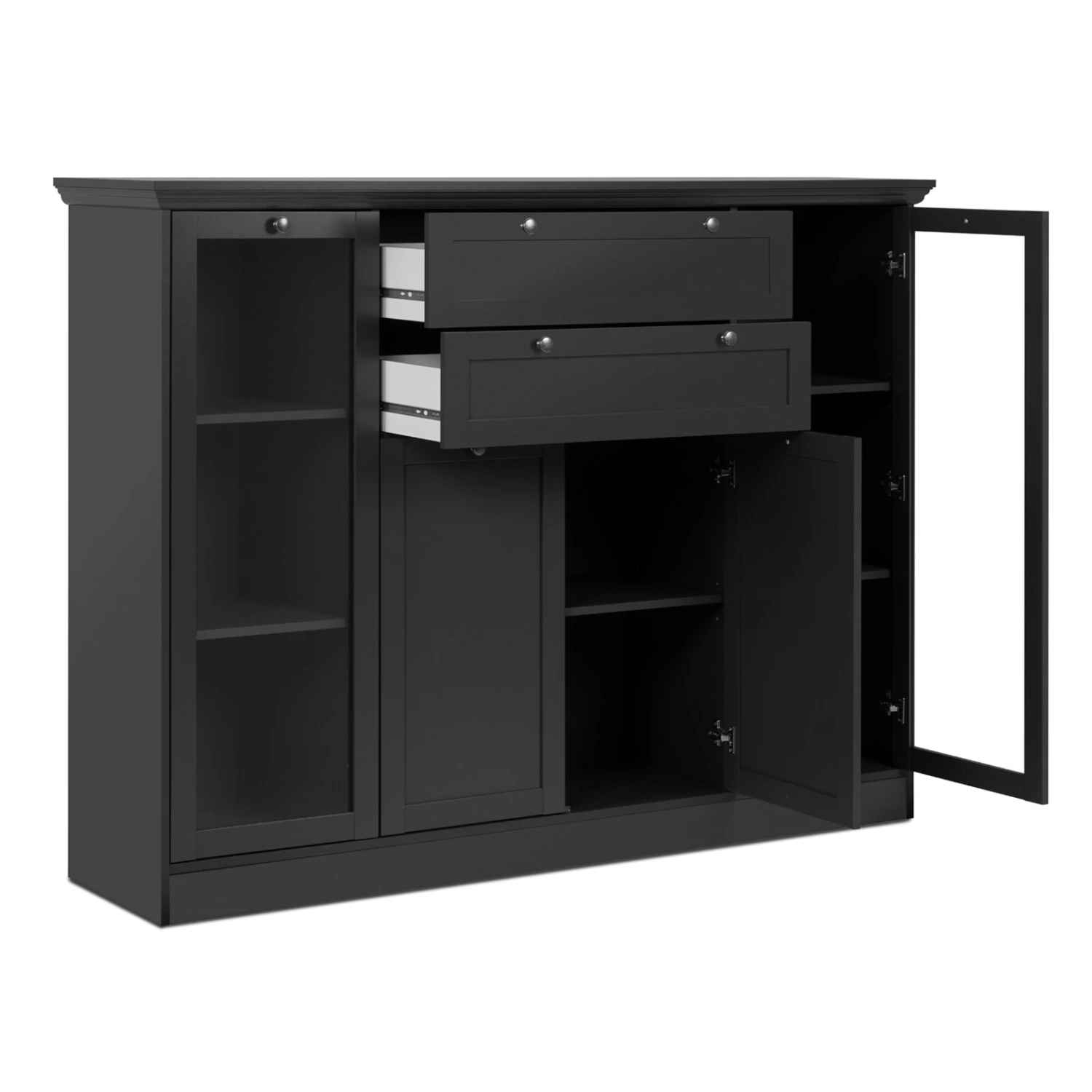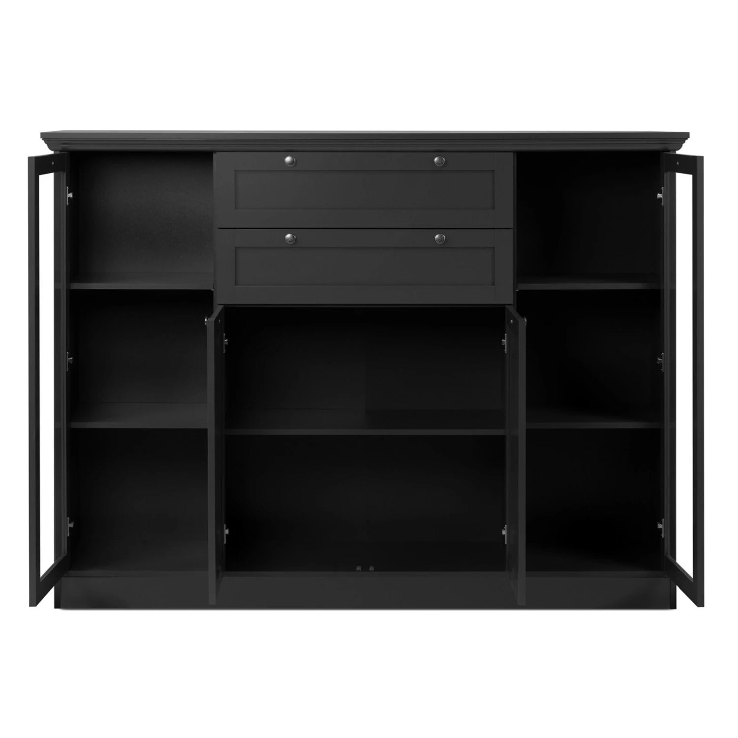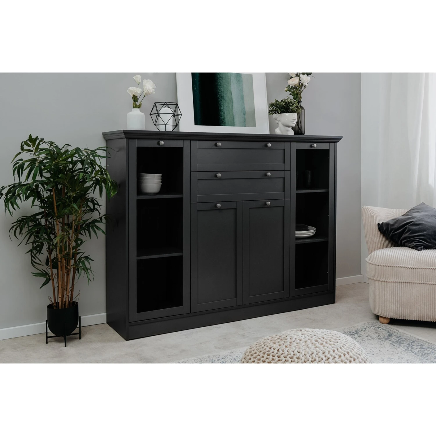 Ergänzen Sie Ihr durchdachtes Wohnzimmer mit dem großen Highboard VERA im Landhaus-Stil! Hier finden Sie hinter insgesamt vier Türen, davon zwei Glastüren, fünf Einlegeböden, um verschiedene Utensilien zu lagern. Auch in zwei Schubkästen können Sie verschiedene Haushaltsdinge lagern.