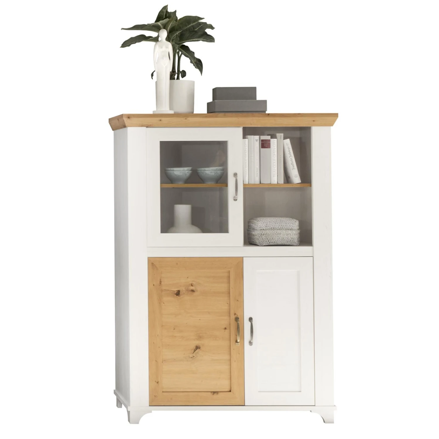Der Mix aus weißer Anderson Pine und Artisan Eiche Nachbildung macht diese Highboardvitrine zum echten Hingucker. Hinter der Glastür und in den beiden offenen Fächern können Sie Ihre Bilder und Dekorationen in Szene setzen und hinter den beiden Holztüren haben Sie die Möglichkeit, die verschiedensten Gebrauchsgegenstände nicht sichtbar unterzubringen.