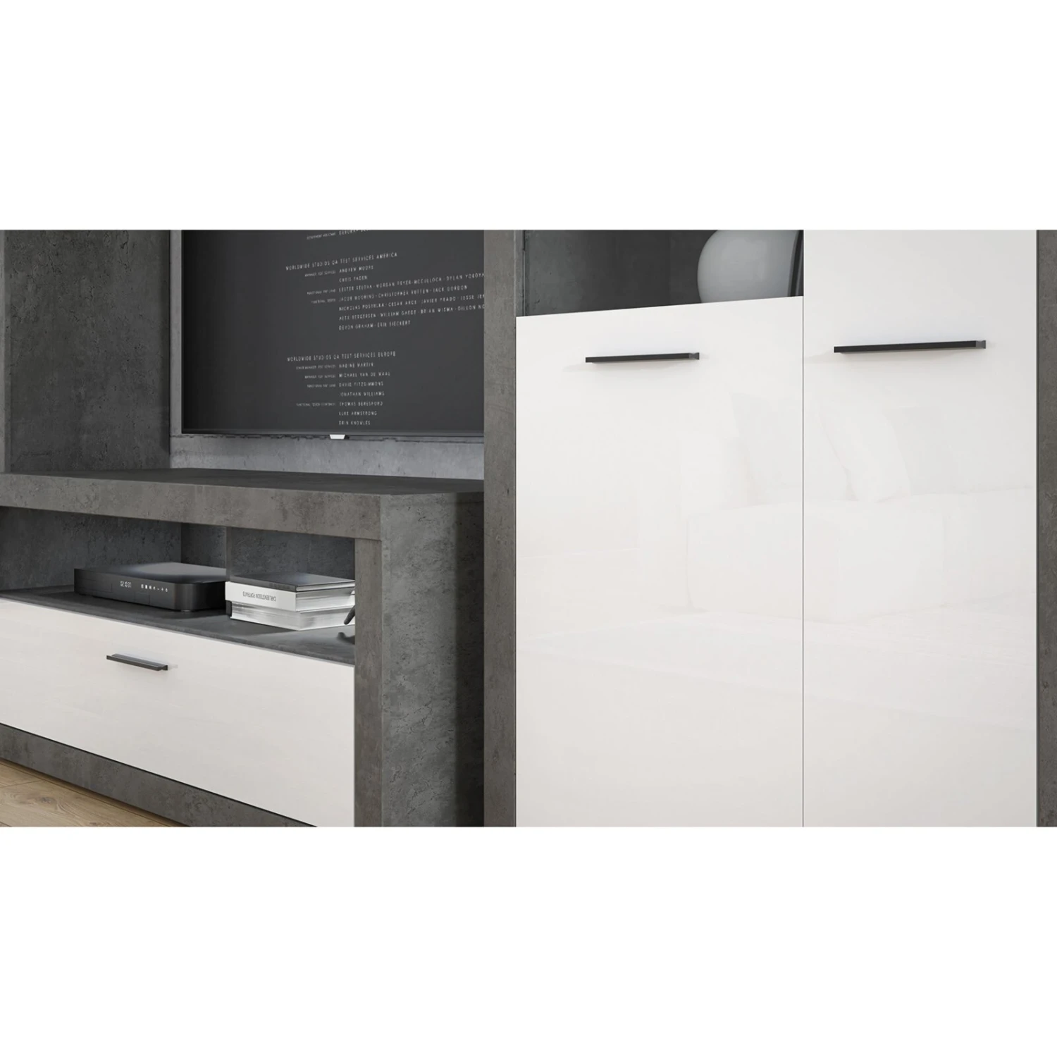In dieser Highboardvitrine lassen sich entweder Dekoelemente oder andere Gegenstände platzieren. Hinter zwei Türen finden Sie genügend Platz, die weiße Hochglanzfront in Kombination mit dem Korpus in Betonoptik passt in jedes Wohnzimmer.