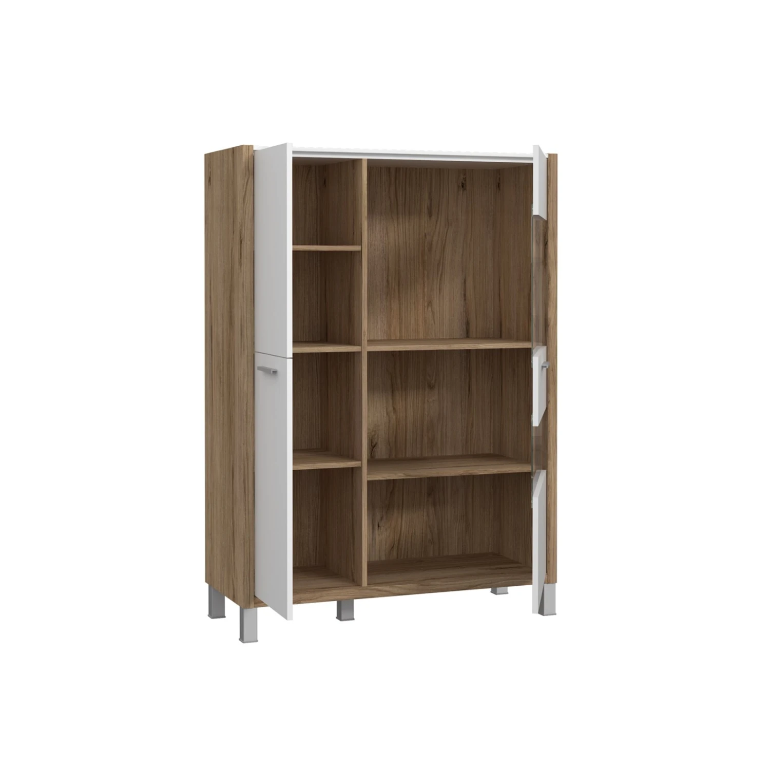 Dieses Highboardvitrine ist der ideale Stauraum für Ihre Gegenstände. Das moderne Design mit einer weißen Front fügt sich in jeglichen Wohnstilen passend ein. Die rechte Tür verfügt über Glas-Elemente, sodass Ihre platzierten Haushaltsutensilien oder Lieblingsstücke immer von außen sichtbar sind.