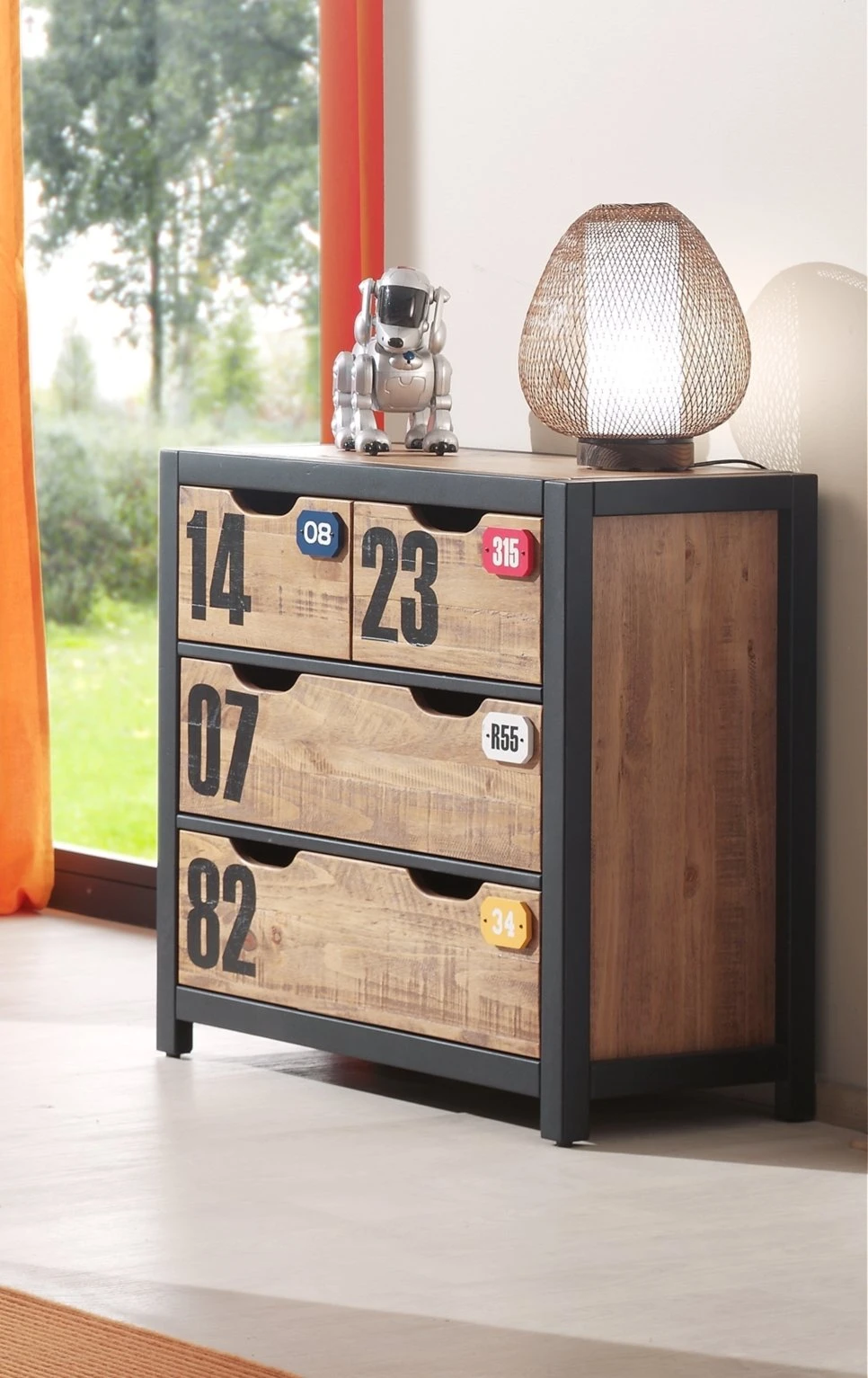 Coole und trendige Kommode ALEX mit viel Stauraum in insgesamt vier Schubkästen auf Metallauszügen. Teilmassiv und vorallem robust! Die interessante Rahmenkonstruktion macht das Möbelstück zu einem absoluten Highlight in jedem Kinder- und Jugendzimmer.