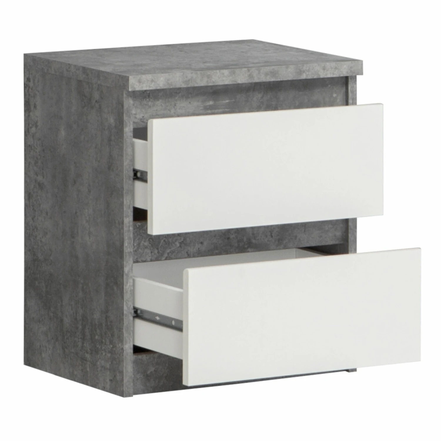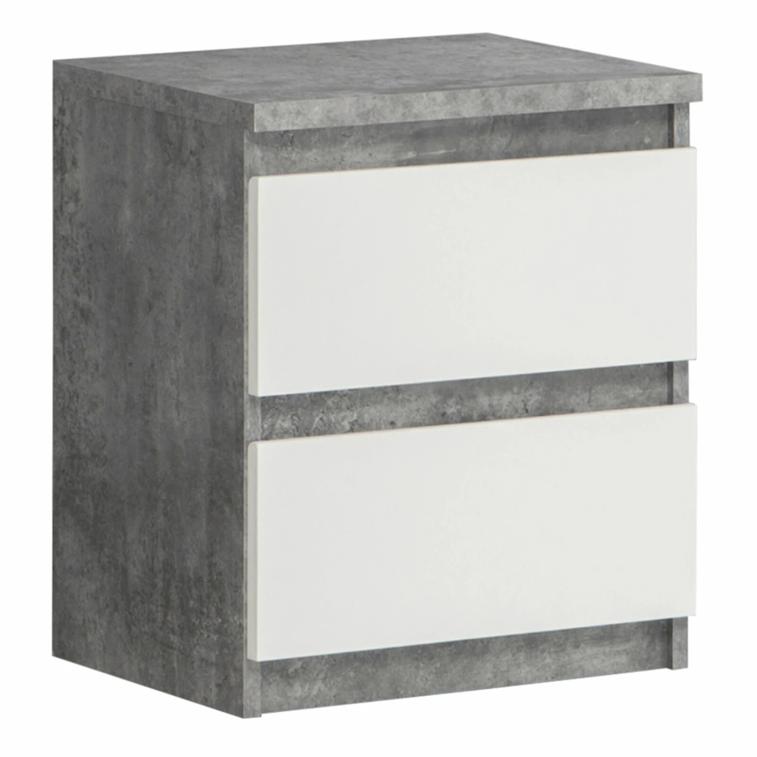 Diese kompakte Kommode, die in Betonoptik und Weiß gehalten ist, dient als idealer Stauraum für kleine Utensilien. Die Schubkästen lassen sich grifflos öffnen.