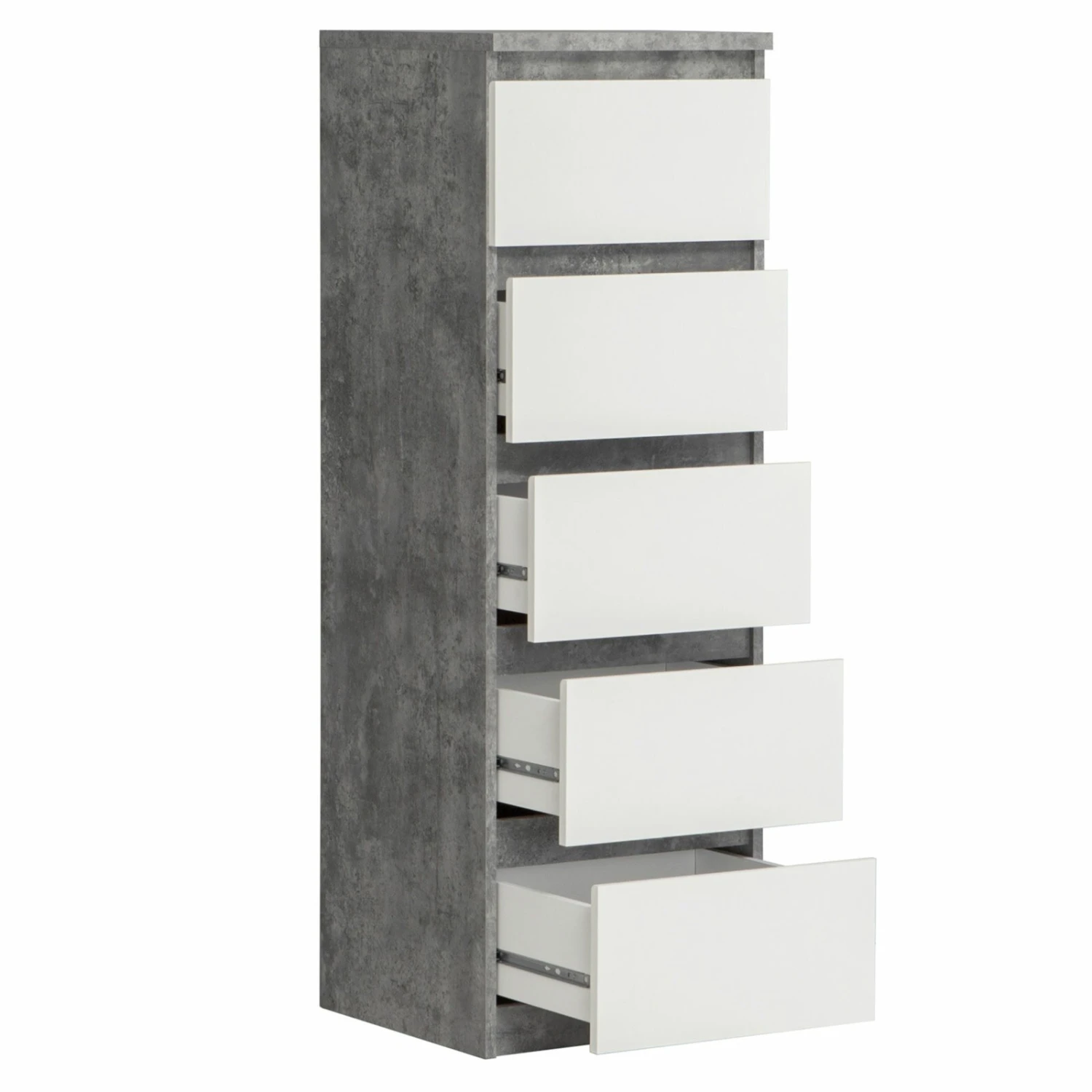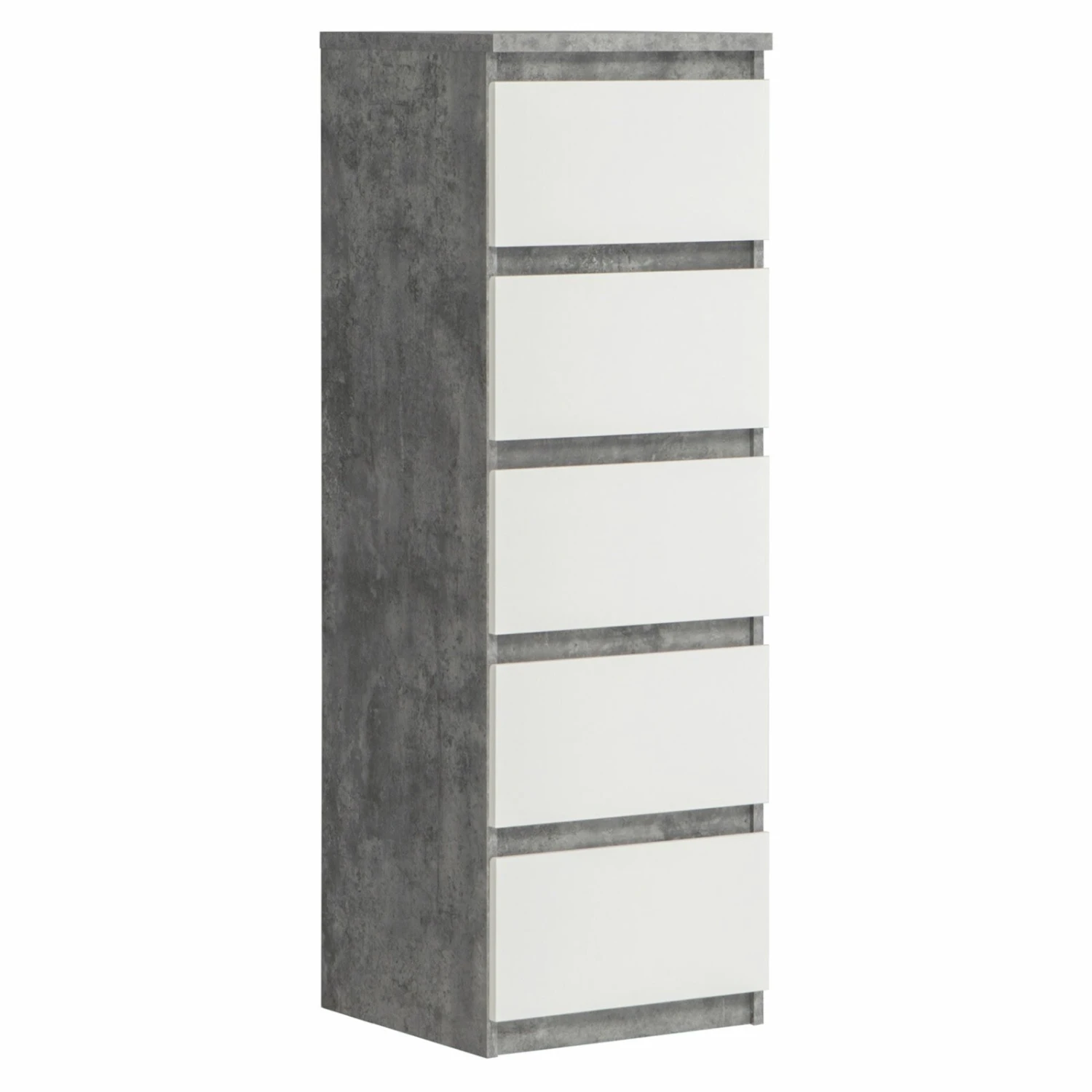 Diese Kommode, die in Betonoptik und Weiß gehalten ist, bietet mit ihren großen Schubfächern eine sehr gute Möglichkeit Utensilien zu verstauen.