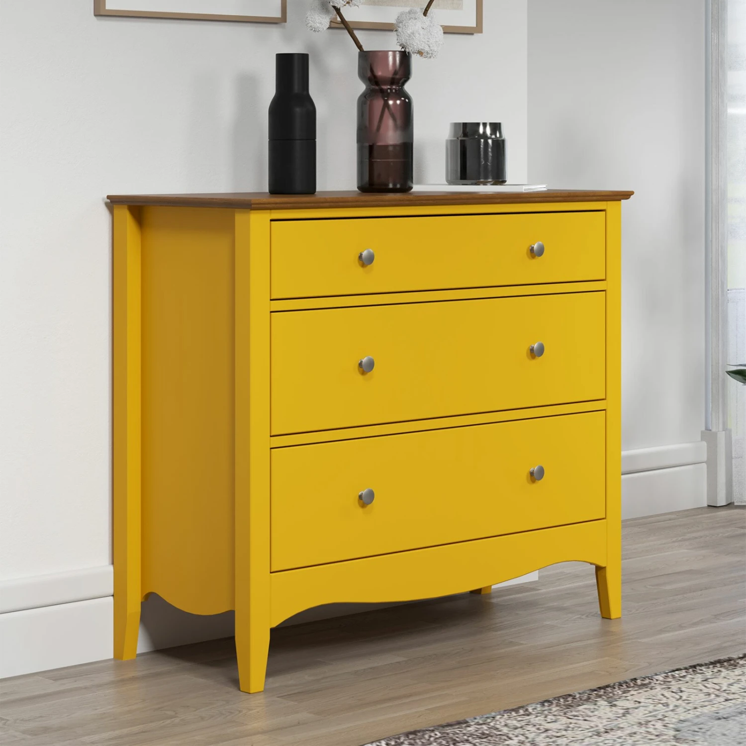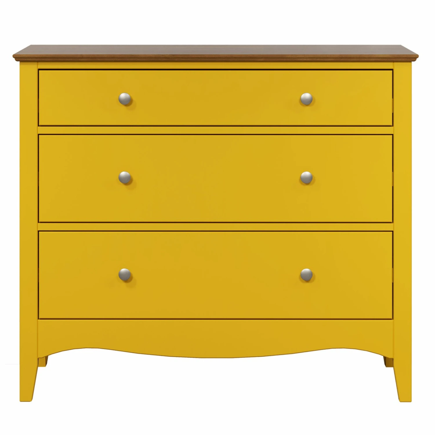 Die gelb-braune Kommode liefert neben der wundervollen Optik die einen positiven Flair verleiht, eine gute Qualität, denn Sie ist aus teilmassiven Kieferholz. Mit Ihren drei Schubkästen mit vollem Auszug bietet Sie obendrein genügend Stauraummöglichkeiten.