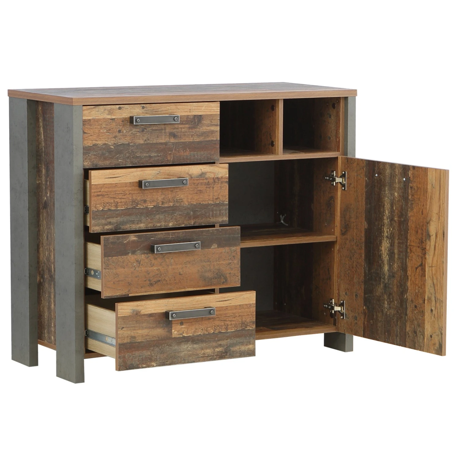 Der rustikale Look von dieser Kommode wird in Ihren Räumlichkeiten ein warmes und wohnliches Ambiente versprühen! Die Kombination aus Holz- und Beton-Optik verleiht diesem Möbelstück ein raffiniertes Äußeres. Hinter einer Tür, in vier Schubkästen und in zwei offenen Fächern bietet diese Kommode reichlich Platz zum Verstauen verschiedenster Untensilien.