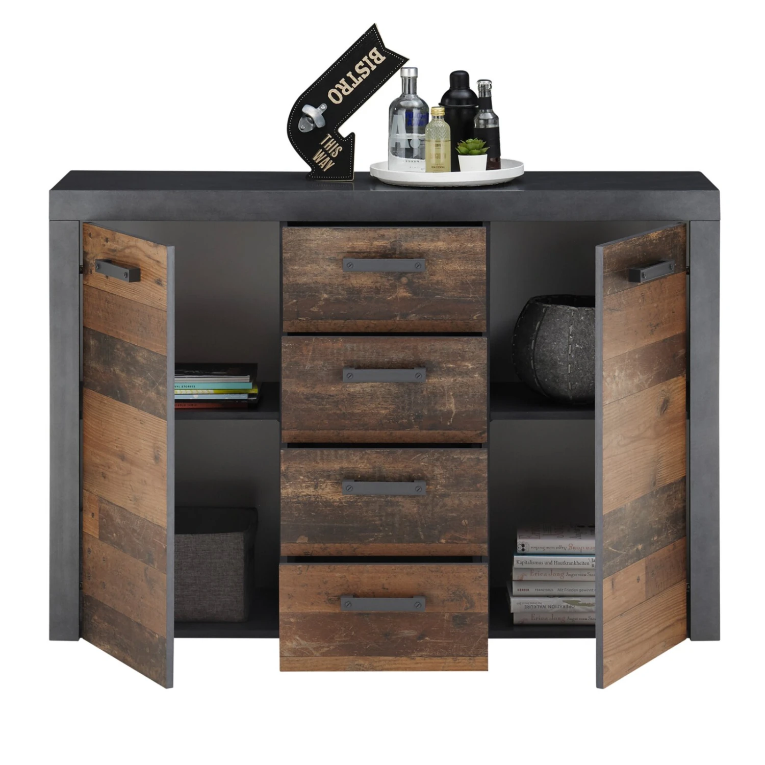Im industriellen Stil präsentiert sich diese etwa 135 Zentimeter breite Kommode. Der Mix aus Old Wood Vintage und Matera Nachbildung lässt das geräumige Möbelstück zum echten Hingucker werden. Hinter zwei Türen und in vier Schubkasten findest du viel Platz für deine Utensilien.
