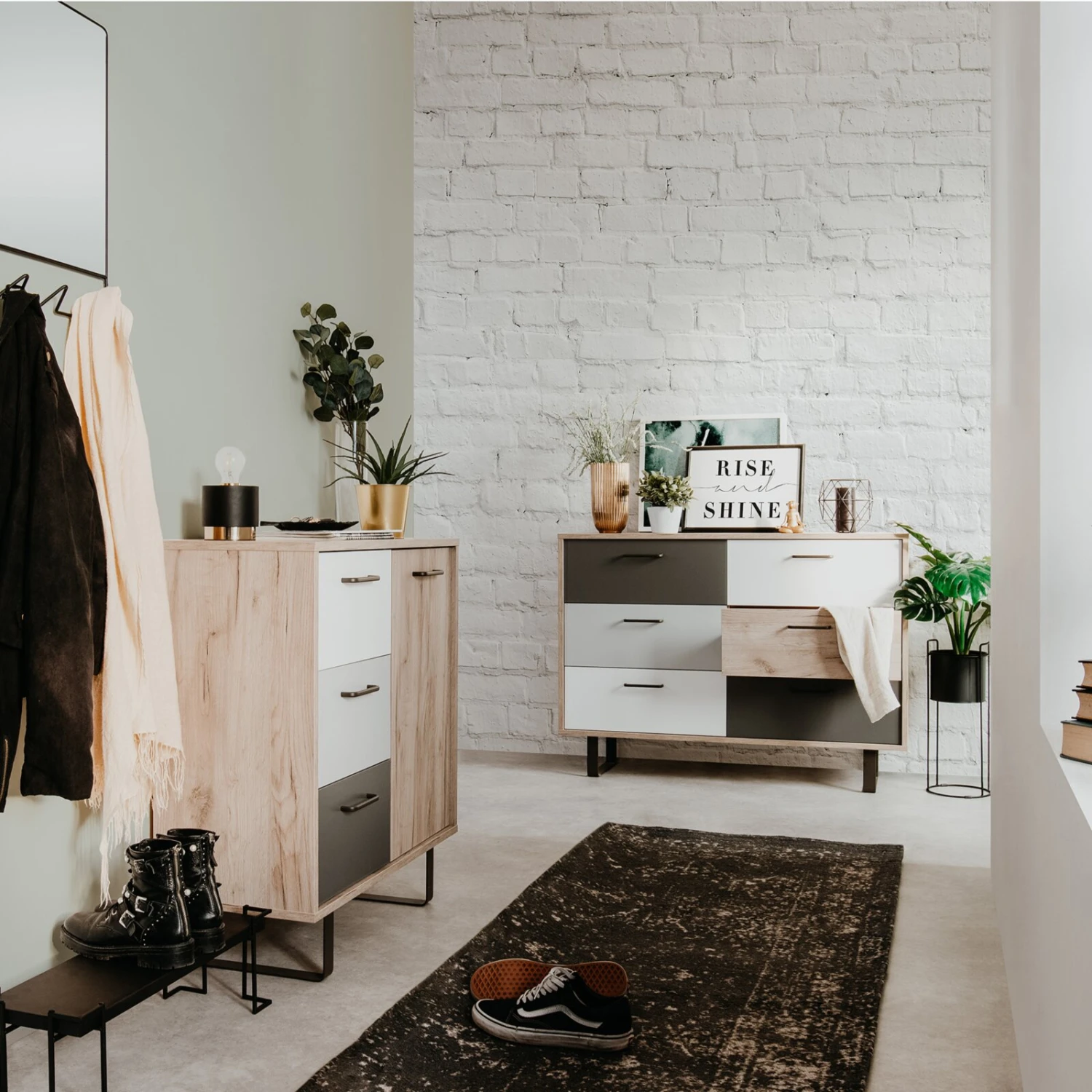 Diese Kommode ist durch den Korpus in Grey Craft Oak Nachbildung und den Fronten in verschiedenen Farben ein Highlight. Hinter der Drehtür und in den drei Schubkästen findet sich ausreichend Platz für alle wichtigen Utensilien.