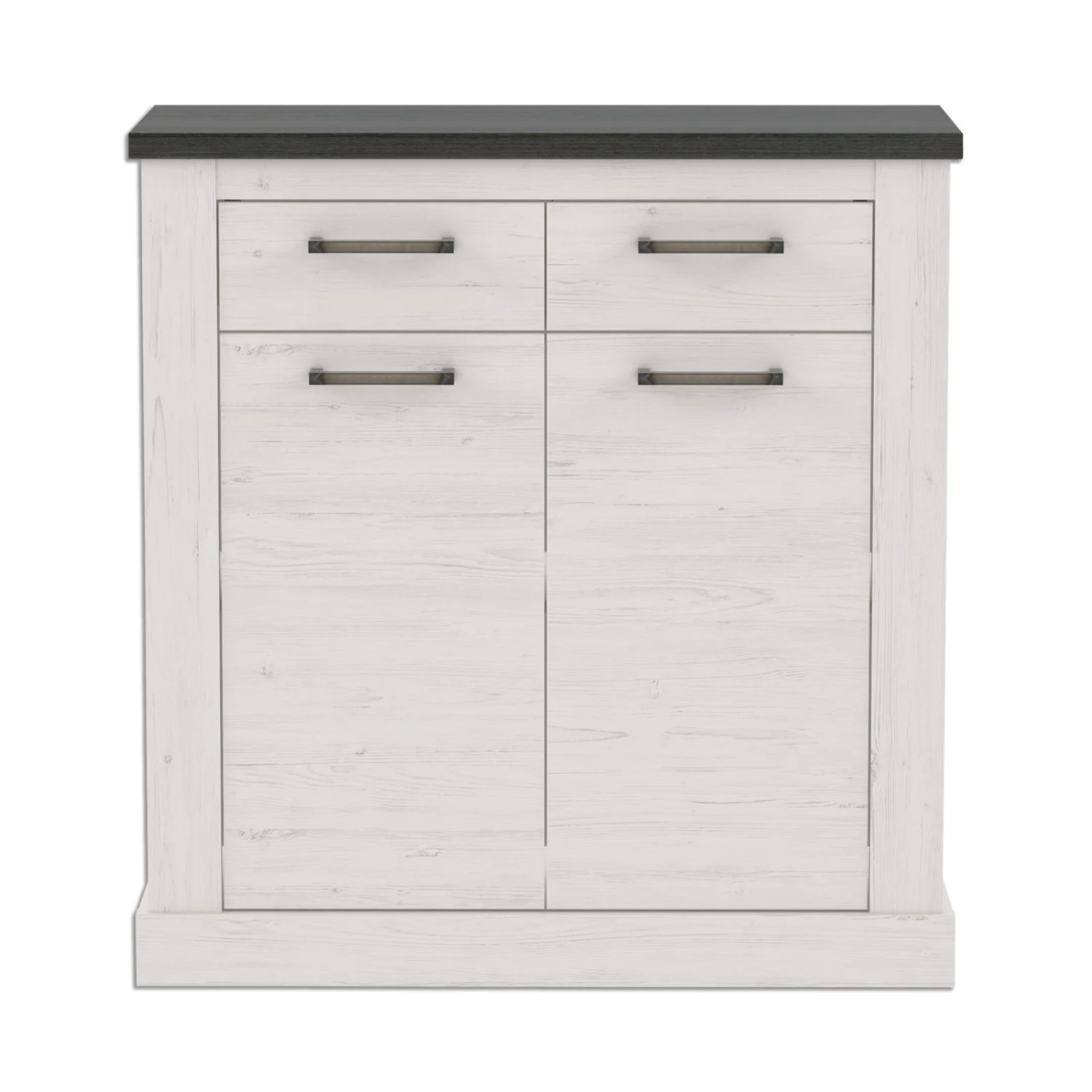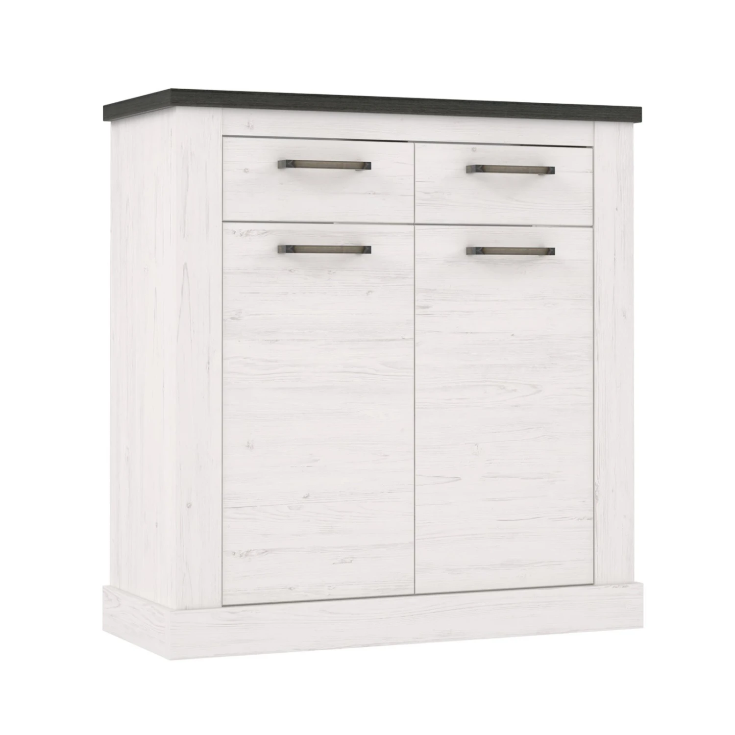 Diese moderne Kommode verfügt über zwei Schubkästen für allerlei Kleinigkeiten. Darunter befinden sich zwei Drehtüren, die ein großes Fach verstecken. Dieses kann durch einen höhenverstellbaren Einlegeboden in zwei Bereiche geteilt werden und bietet Ihnen Raum, um einfach Ordnung halten zu können. Das Äußere ist in weißer Pinie gehalten, bei der man die Holzstruktur erkennen kann. Die Oberplatte wurde in Touchwood abgesetzt, um einen schönen Akzent zu erzeugen. Abgerundet wird das Äußere durch Metallgriffe.
