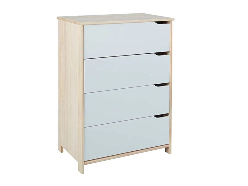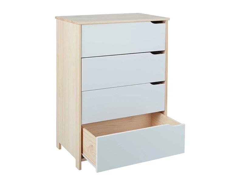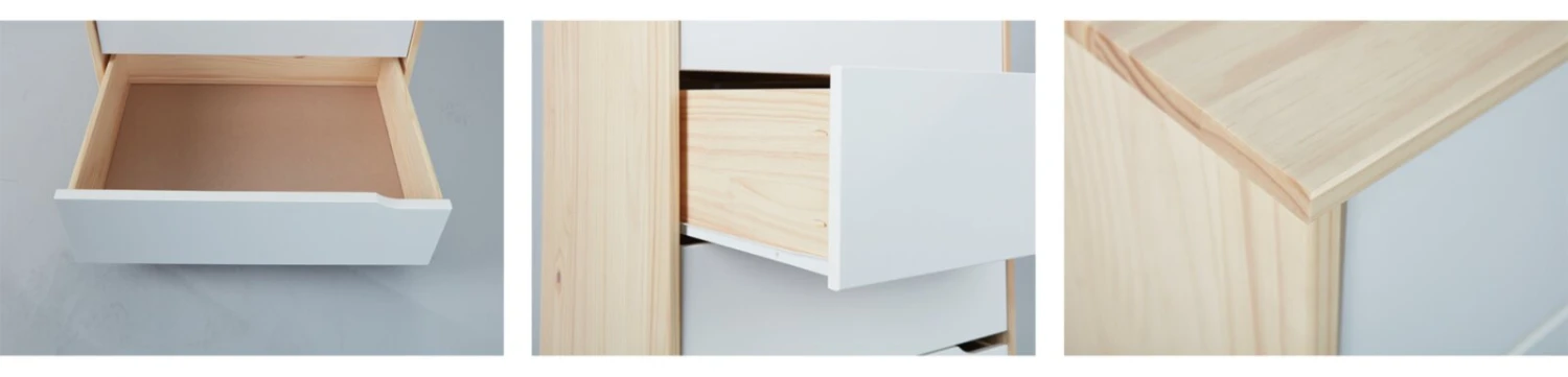 Diese Kommode trägt für den Korpus die Farbbezeichnung Milkyskin. Dies bedeutet, dass sie mit leicht weiß eingefärbter Farbe lackiert worden ist, wodurch eine Art Milchschimmer entsteht. Holen Sie sich den neusten Oberflächentrend nach Hause, denn die Massivholzmaserungen kommen durch den Milchschimmer besonders schön zur Geltung. Die Kommode verfügt über vier grifflose Schubladen. Die Griffmulden und die weißen Fronten runden das skandinavisch angehauchte Design ab.