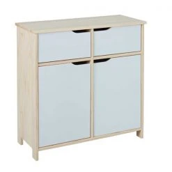 Der Korpus dieser Kommode ist mit leicht weiß eingefärbter Farbe lackiert worden, wodurch eine Art Milchschimmer entsteht. Dieser Milchschimmer heißt Milkyskin und ist der neuste Oberflächentrend. Die Massivholzmaserungen kommen durch den Milchschimmer besonders schön zur Geltung. Die Kommode verfügt über zwei Drehtüren und zwei Schubkästen. Die Griffmulden und die weißen Fronten runden das moderne, skandinavische Design ab.