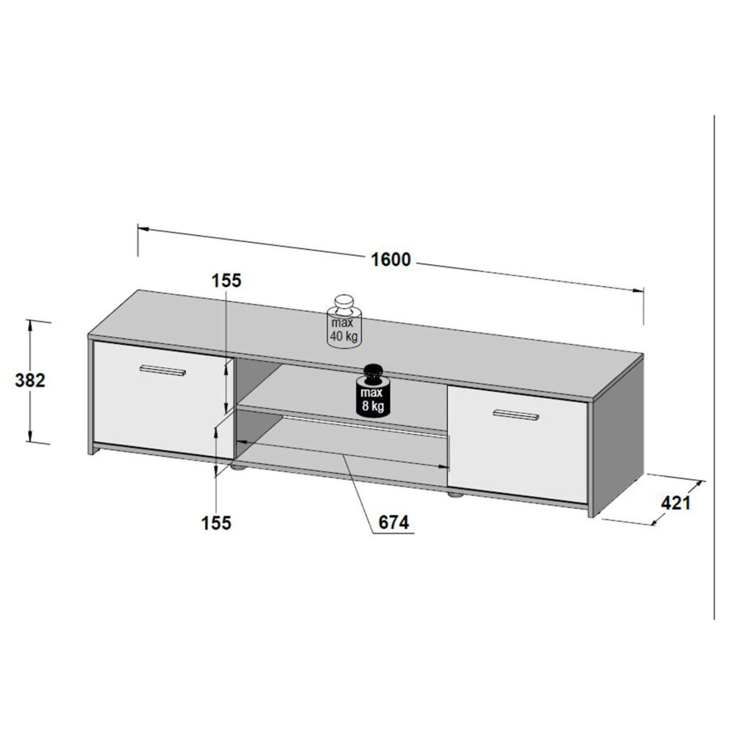 Das topmoderne Lowboard hat eine Breite von 160 cm und ist in einer Beton-Optik gehalten. Die weiß abgesetzten Türen runden die raffinierte Optik noch zusätzlich ab und sorgen für das gewisse Etwas. Hinter zwei Türen finden Sie reichlich Platz um die unterschiedlichsten Dinge zu verstauen und zwei Gerätefächer bieten Platz für Ihr TV-Zubehör.