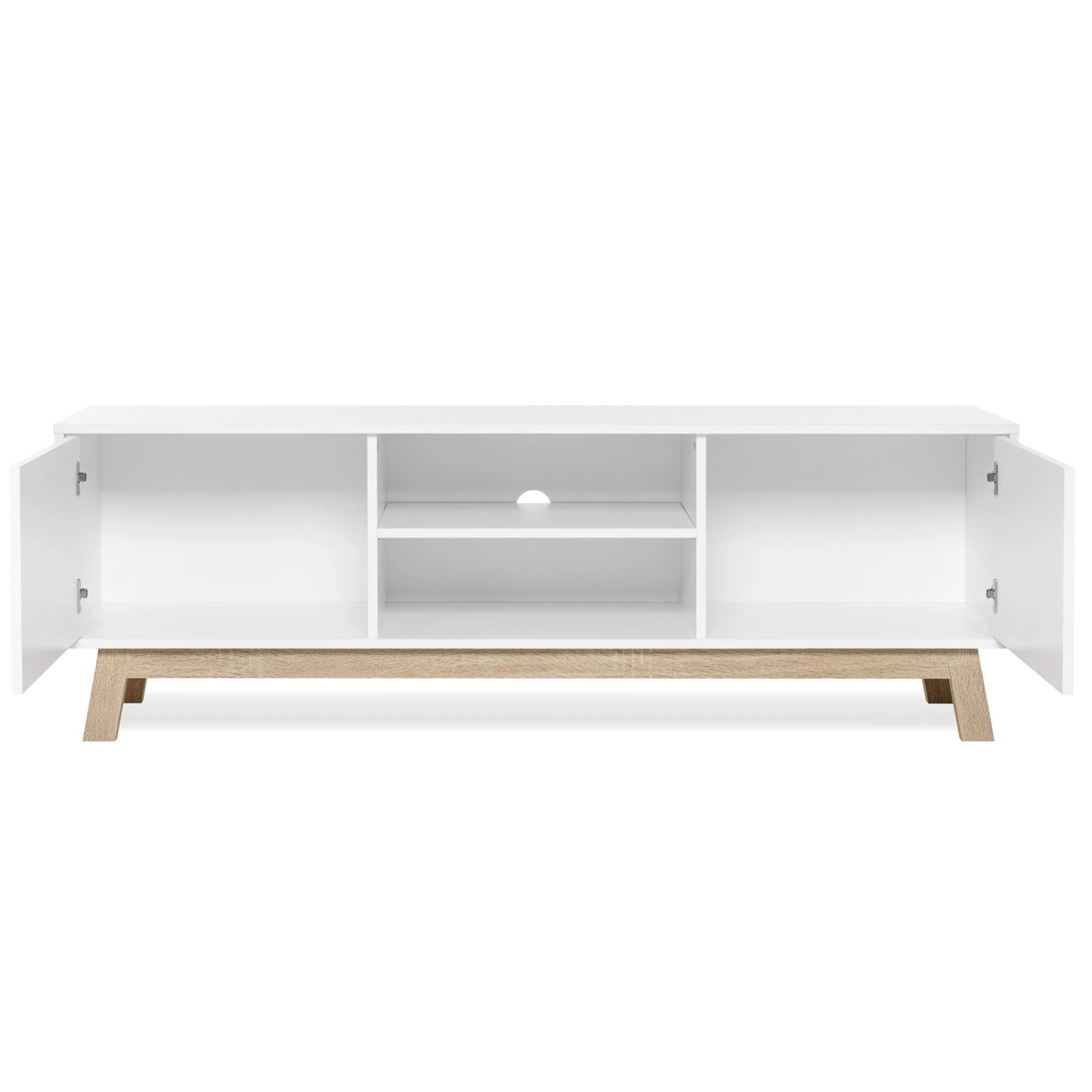 Das Lowboard im reduzierten, skandinavischen Stil ist eine elegante Ergänzung für Ihr Wohnzimmer. Unterstrichen wird der Skandi-Look von der matt-weißen Oberfläche zusammen mit den stabilen, konischen Massivholz-Füßen. In den beiden offenen Fächern haben Sie die Möglichkeit einen Receiver unterzubringen, Ihre Spielkonsole oder ein anderes mit dem Fernseher verbundenes Gerät. Die beiden mit einer Tür verschlossenen Fächer bieten sich an, für Dinge, die Sie geordnet ablegen wollen, wie beispielsweise Vasen, die Sie aktuell nicht benötigen, Bücher oder Zeitschriften.