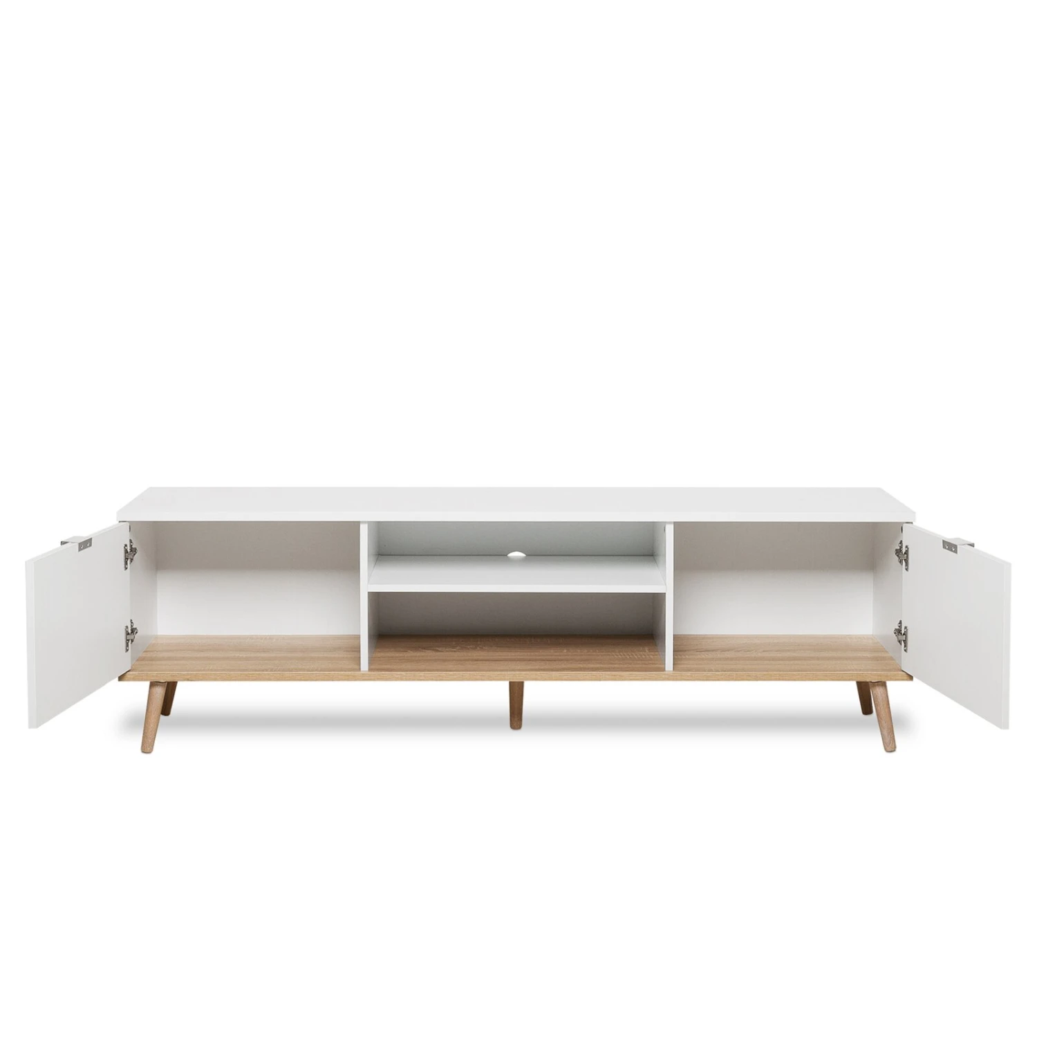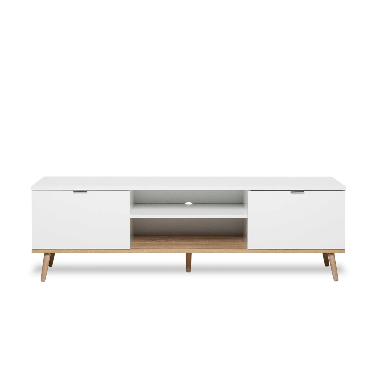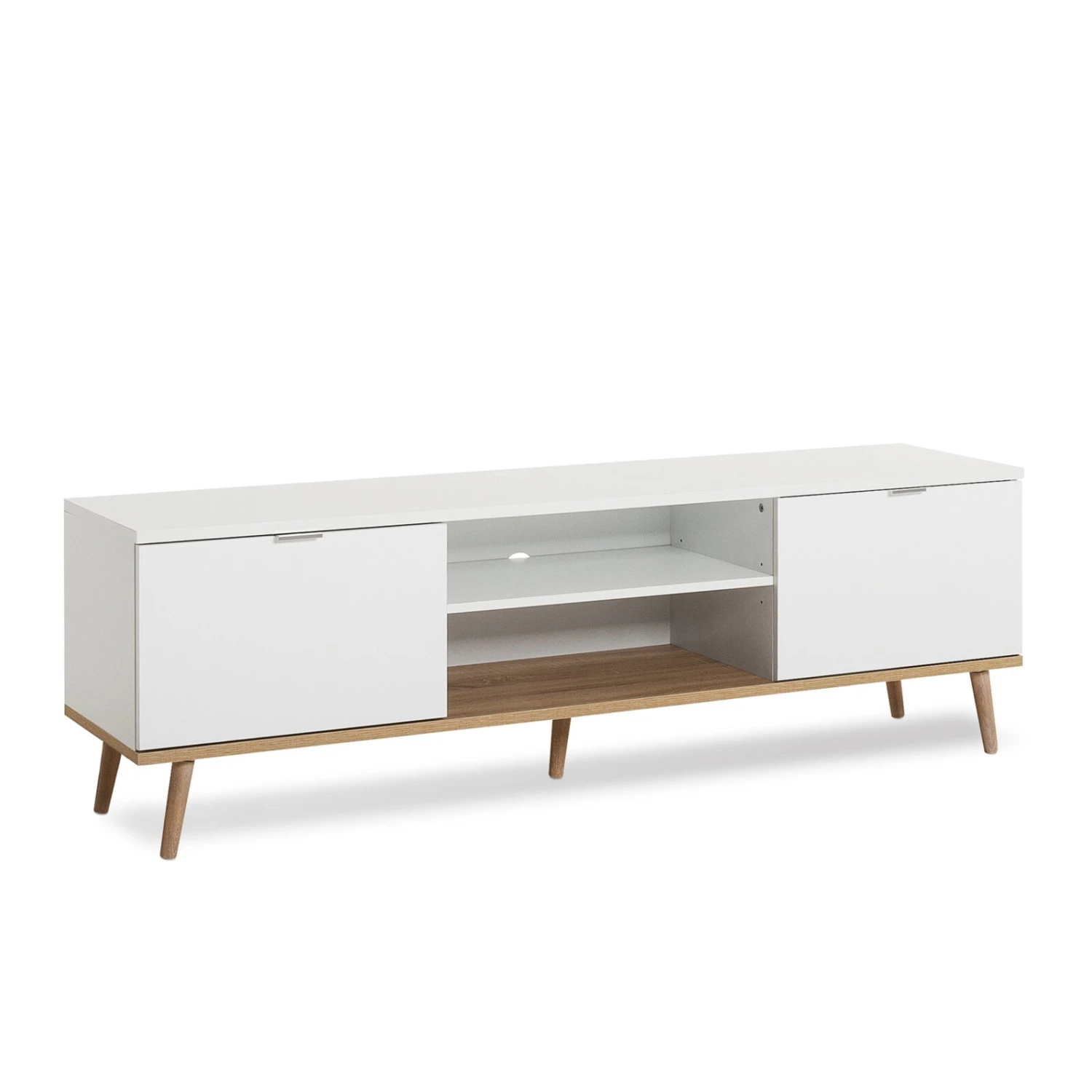 Das Lowboard im reduzierten, skandinavischen Stil ist eine elegante Ergänzung für Ihr Wohnzimmer. Unterstrichen wird der Skandi-Look von der matt-weißen Oberfläche zusammen mit den stabilen, konischen Massivholz-Füßen. In den beiden offenen Fächern haben Sie die Möglichkeit einen Receiver unterzubringen, Ihre Spielkonsole oder ein anderes mit dem Fernseher verbundenes Gerät. Die beiden mit einer Tür verschlossenen Fächer bieten sich an, für Dinge, die Sie geordnet ablegen wollen, wie beispielsweise Vasen, die Sie aktuell nicht benötigen, Bücher oder Zeitschriften.