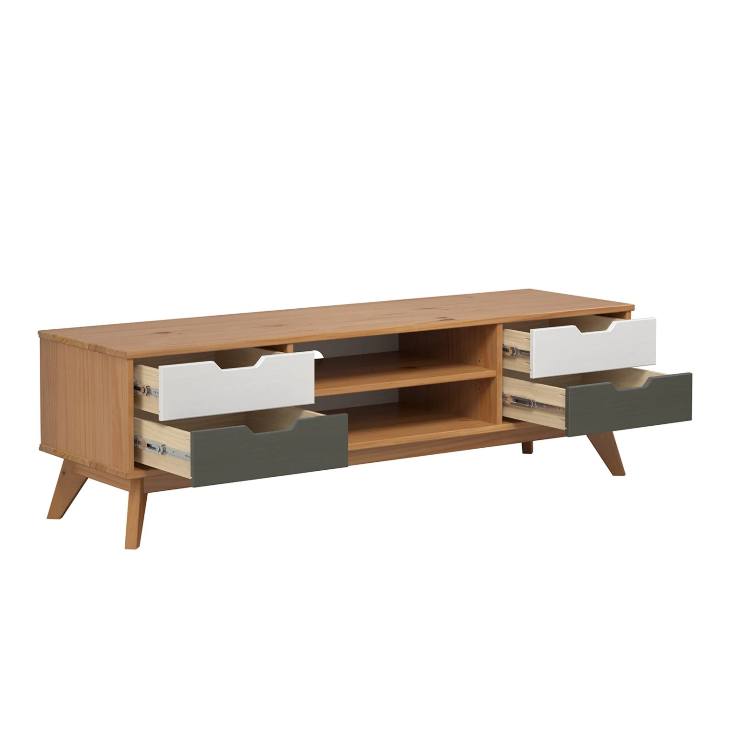 Das Lowboard eignet sich hervorragend, um einen Fernseher und das Zubehör zu platzieren. Außerdem bietet es mit seinen vier Schubkästen und zwei offenen Fächern sehr viel Stauraum.