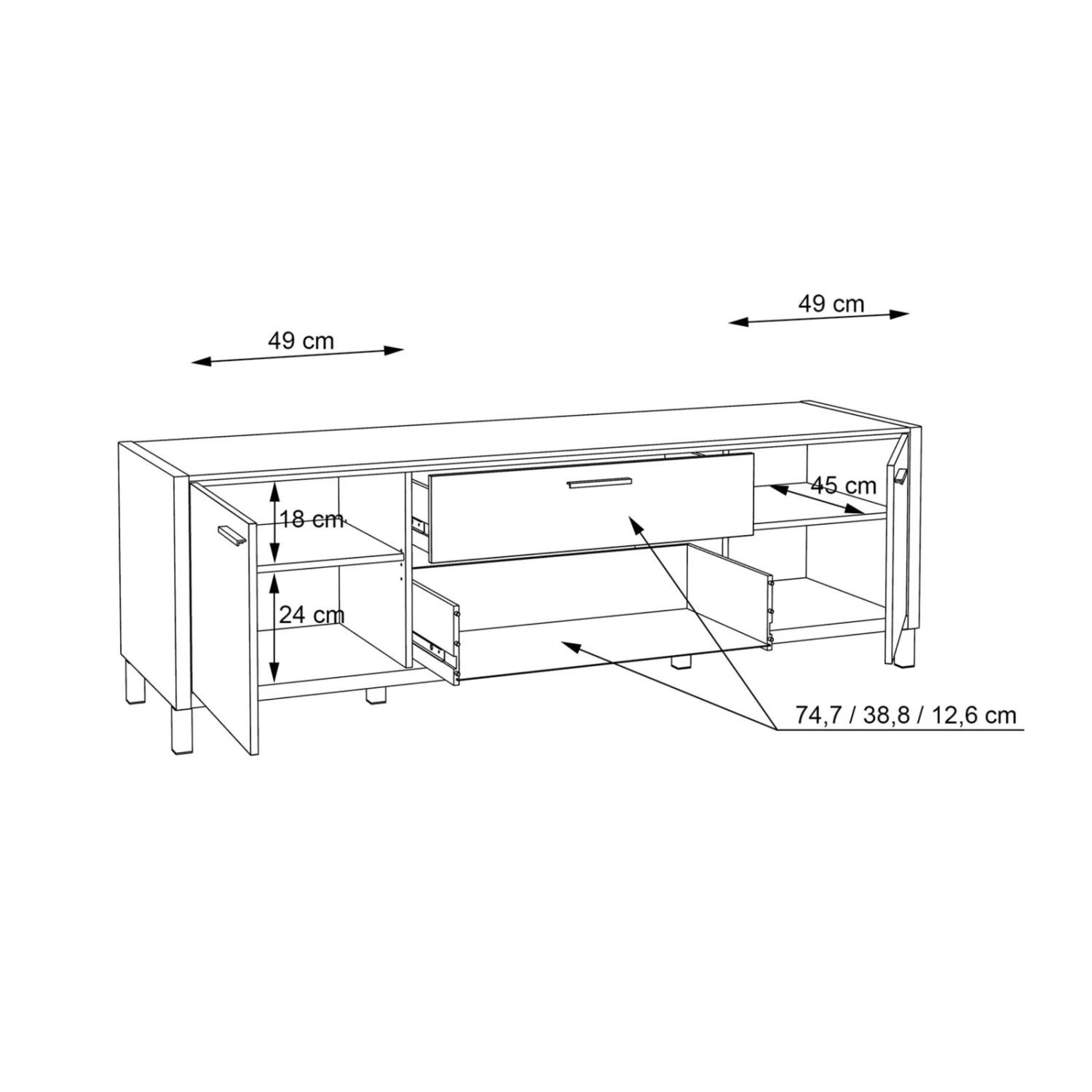 Dieses Lowboard erstrahlt in einer weißen Front und in Cantania Eiche Nachbildung. Das moderne und schlichte Design fügt sich bestens in den sämtlichsten Wohnstilen ein. Auf diesem Lowboard können Sie ideal einen Fernseher oder andere Deko-Artikel platzieren und so in Geltung bringen. Mit zwei Türen und zwei Schubkästen ist für ausreichend Stauraum gesorgt.