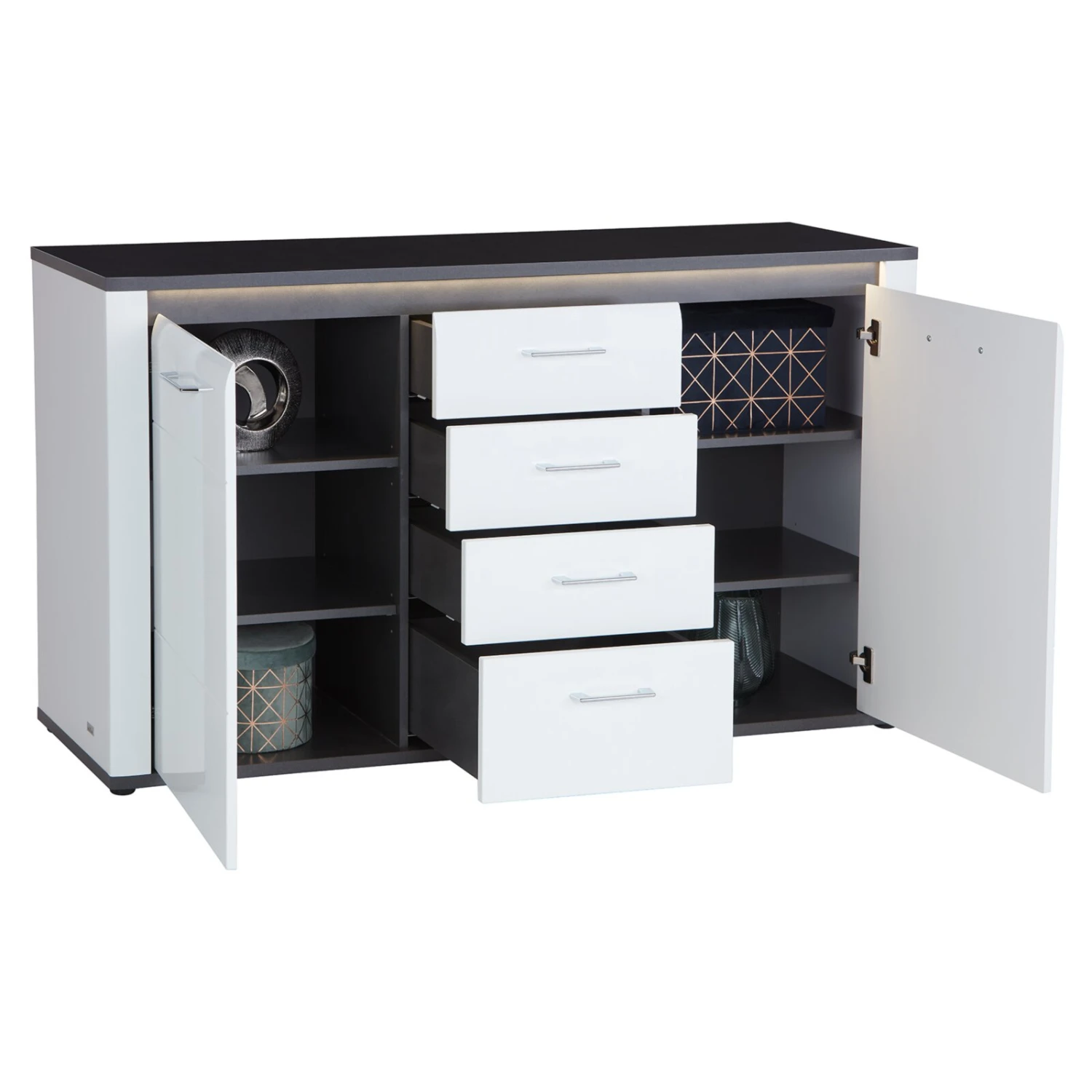 Diese Kommode in Weiß Hochglanz ist mit vier Schubladen und zwei Türen ausgestattet. Dadurch verschaffen Sie sich zusätlichen Stauraum und sorgen für mehr Ordnung in der Wohnung. Die verchromten Metallgriffe runden das moderne Design des Möbelstücks perfekt ab. Ein besonderes Highlight ist das integrierte LED-Licht.