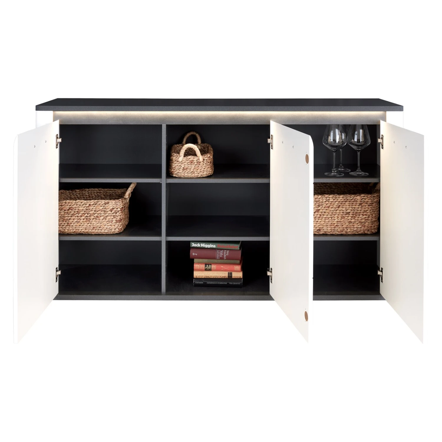 Auf einer Breite von 156 cm bietet das Sideboard von Luca Bessoni ausreichend Platz zum Ordnen Ihrer Gegenstände. So sorgen Sie für noch mehr Ordnung in der Wohnung. Die verchromten Metallgriffe runden das moderne Design des Möbelstücks perfekt ab. Ein besonderes Highlight ist das integrierte LED-Licht.