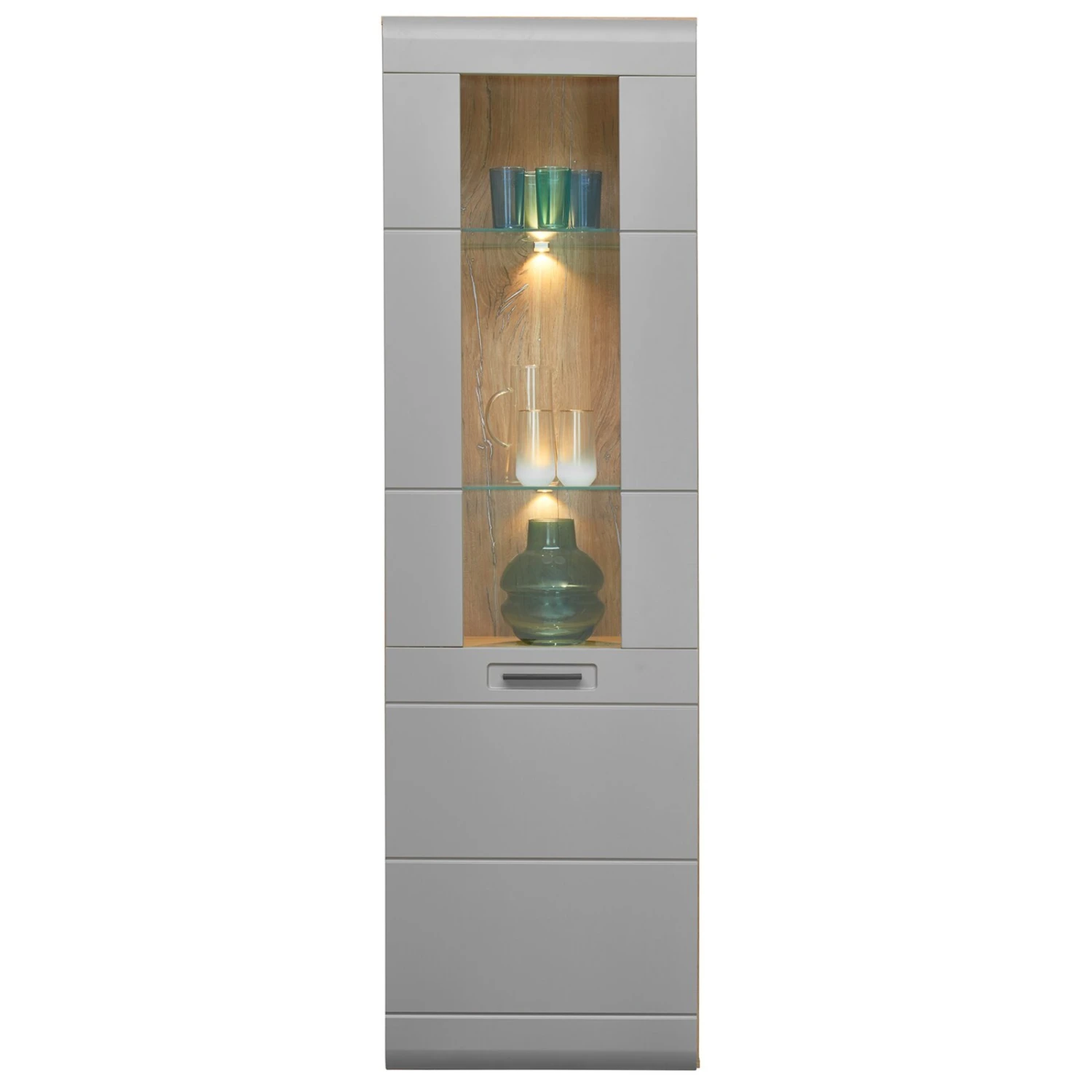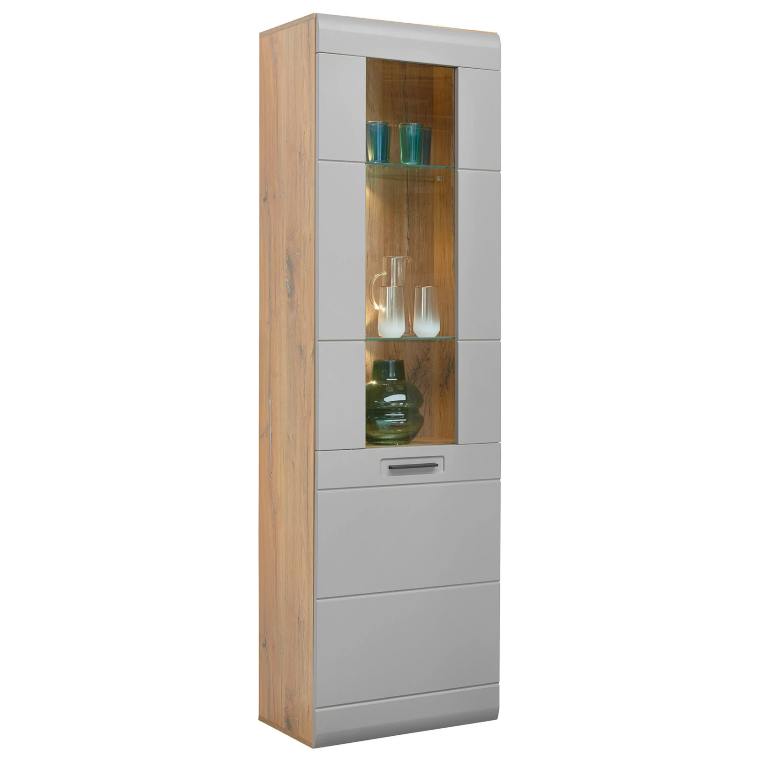 Viel Stauraum und eine topmoderne Optik bietet die Luca Bessoni Standvitrine. Das moderne Erscheinungsbild erlangt die Vitrine durch die raffinierte Farbkombination aus Basalt und Flagstaff Eiche Nachbildung. Hinter der Tür befinden sich zwei Glas- und zwei Holzeinlegeböden, die reichlich Ablagfläche für deine Dekorationen und weitere Utensilien zur Verfügung stellen.