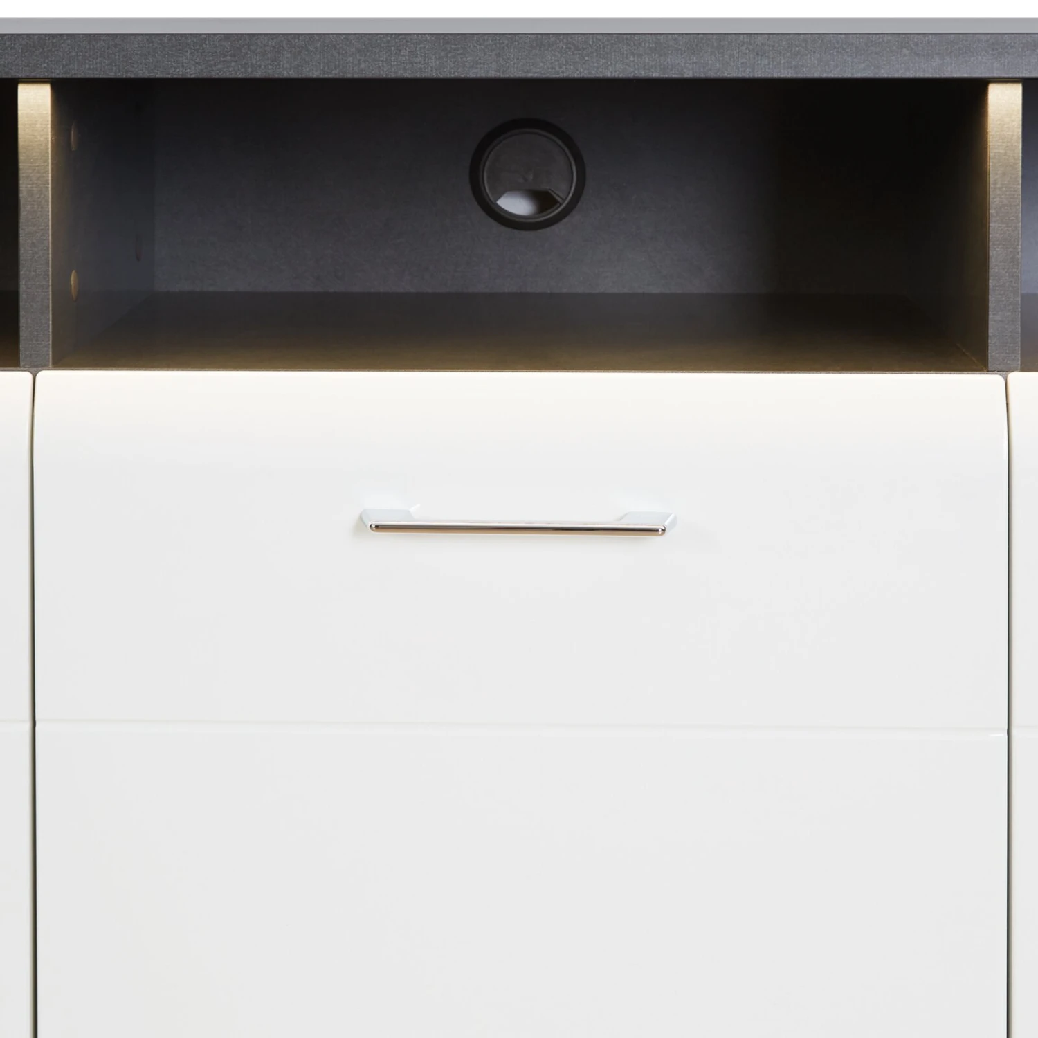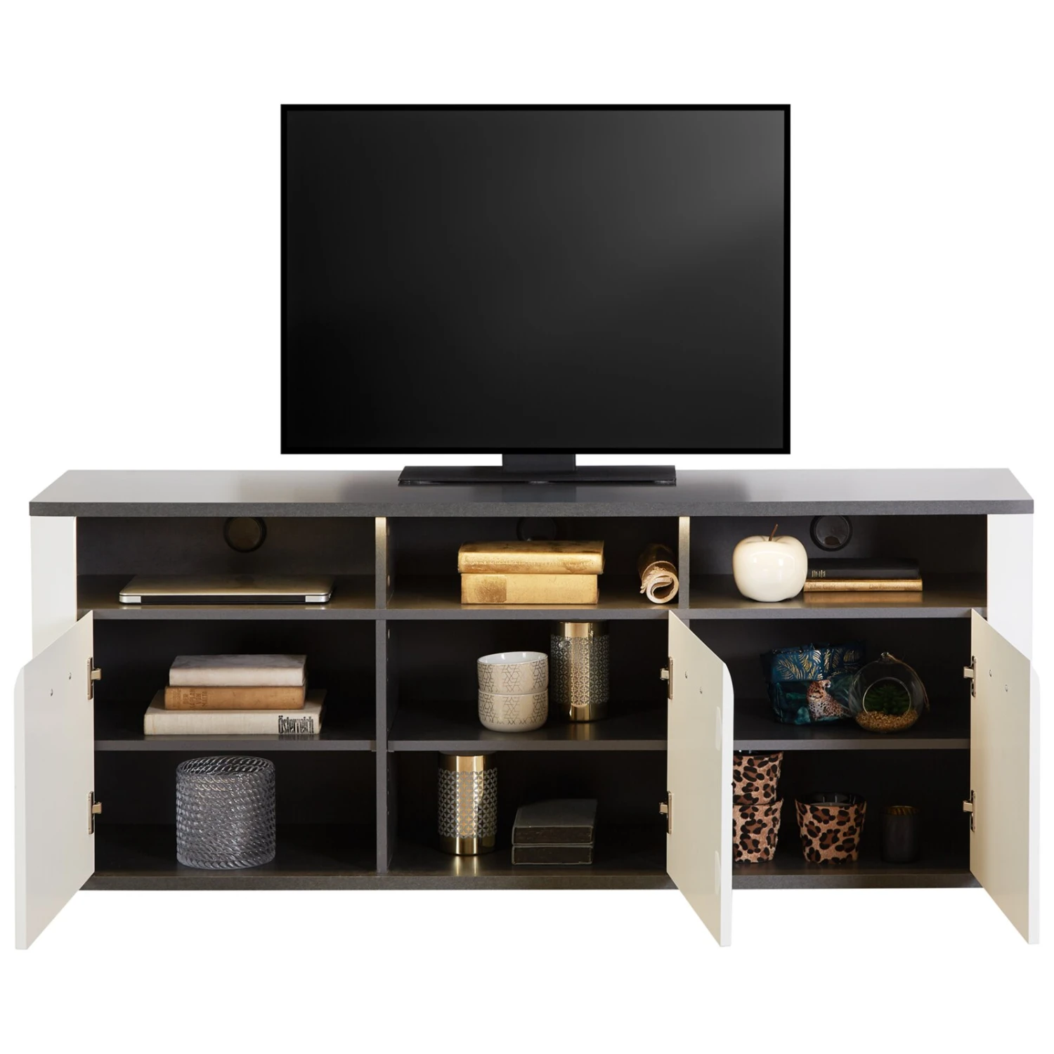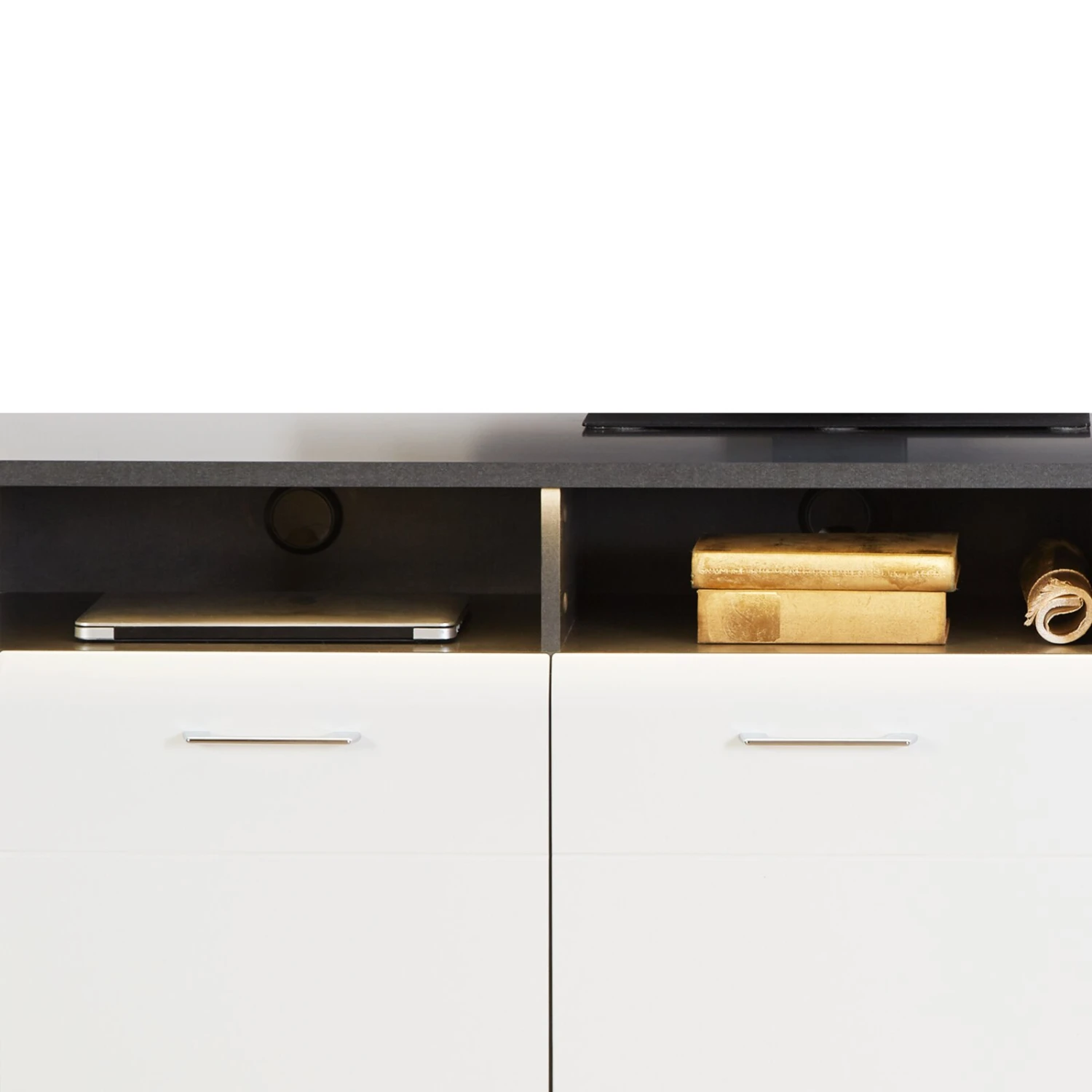 Das TV-Lowboard ALASSIO erstrahlt im hellen Weiß, das ausgezeichnet durch den Absatz in Matera Dunkel ergänzt wird. In den drei offenen Fächern haben Sie ausreichend Platz zum Abstellen Ihrer Receiver oder beispielsweise einer Spielkonsole. Durch einen Kabelkanal können Sie die Kabel direkt zum Fernseher führen. Im Inneren des Schrankes haben Sie die Möglichkeit das zu lagern, was Sie gerne in Griffnähe haben, aber doch lieber hinter einer Tür verstauen wollen. Komfortable Extras sind die chromfarbenen Metallgriffe sowie die angenehme Türdämpfung.