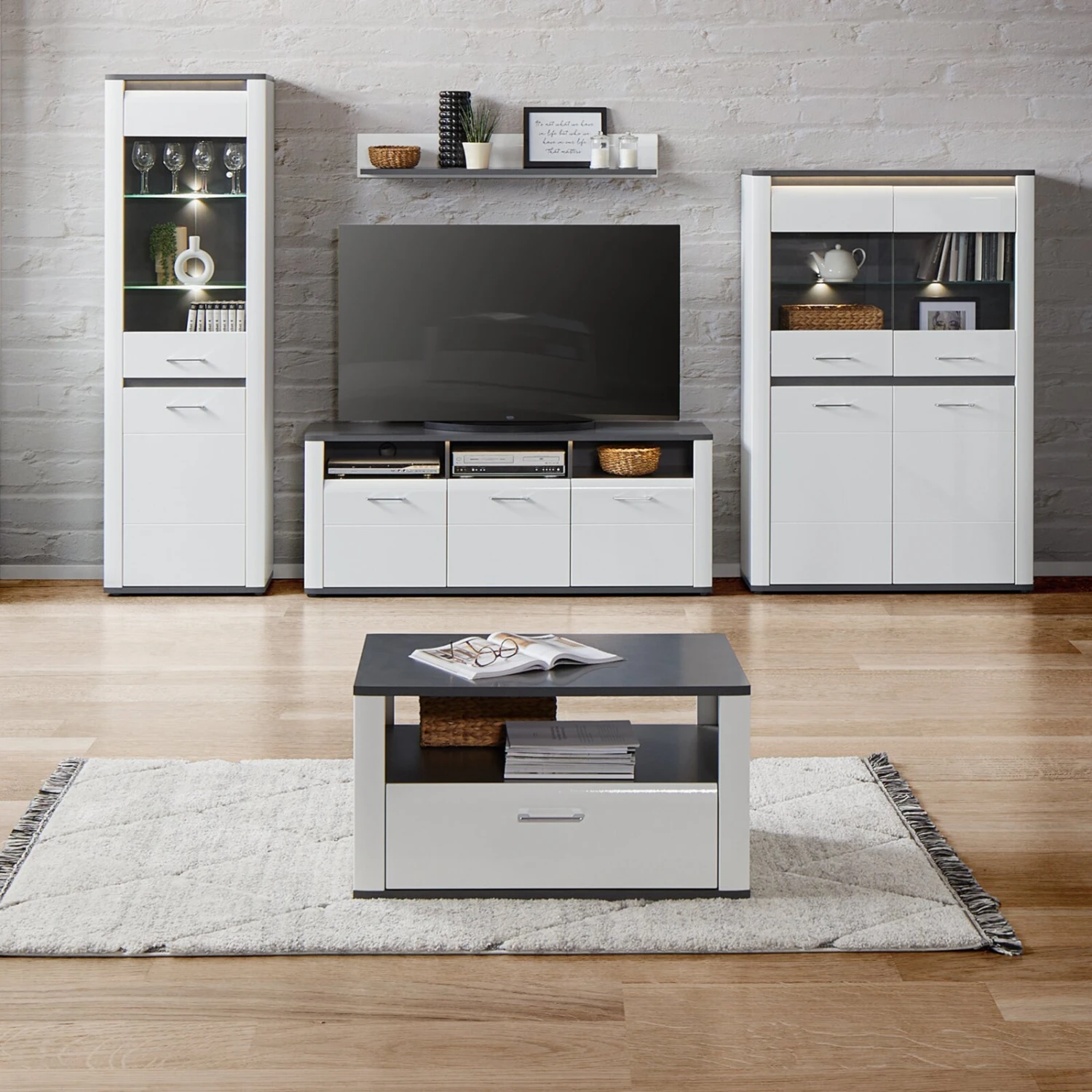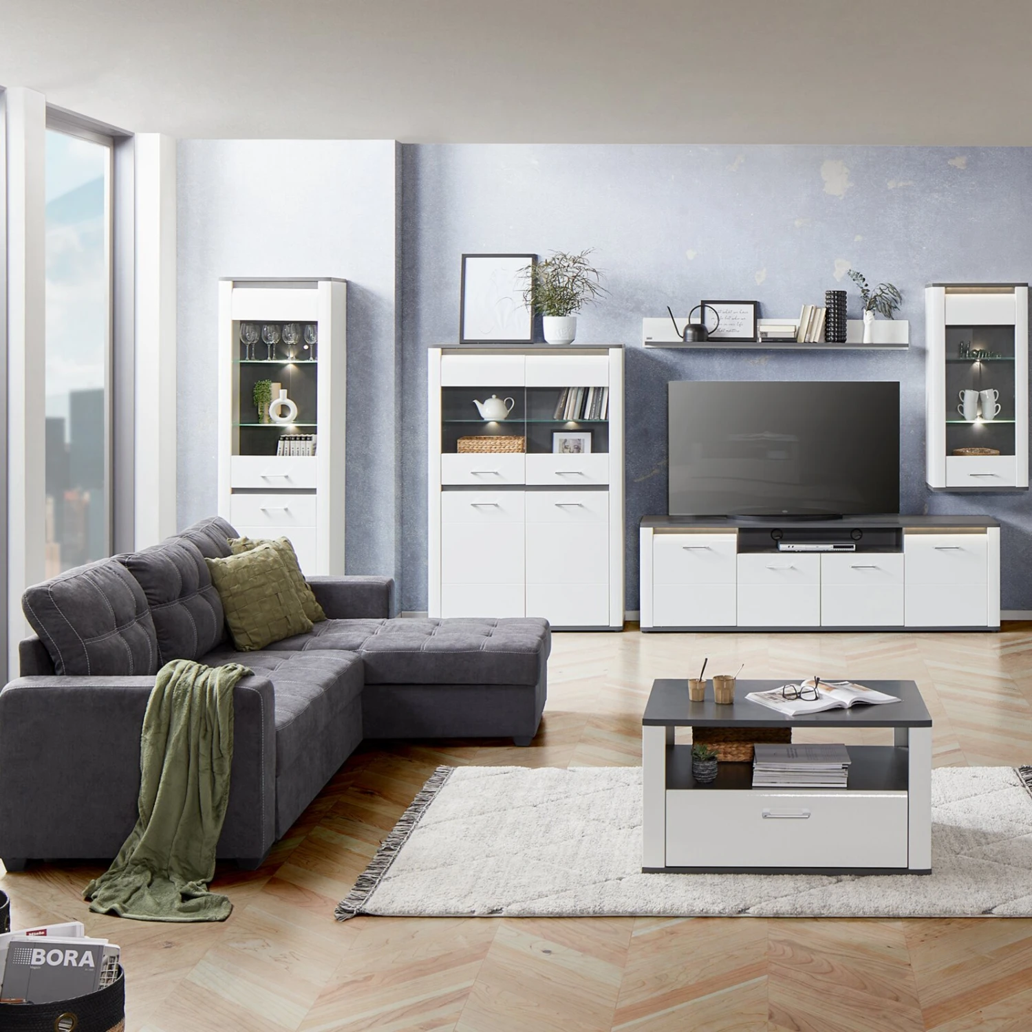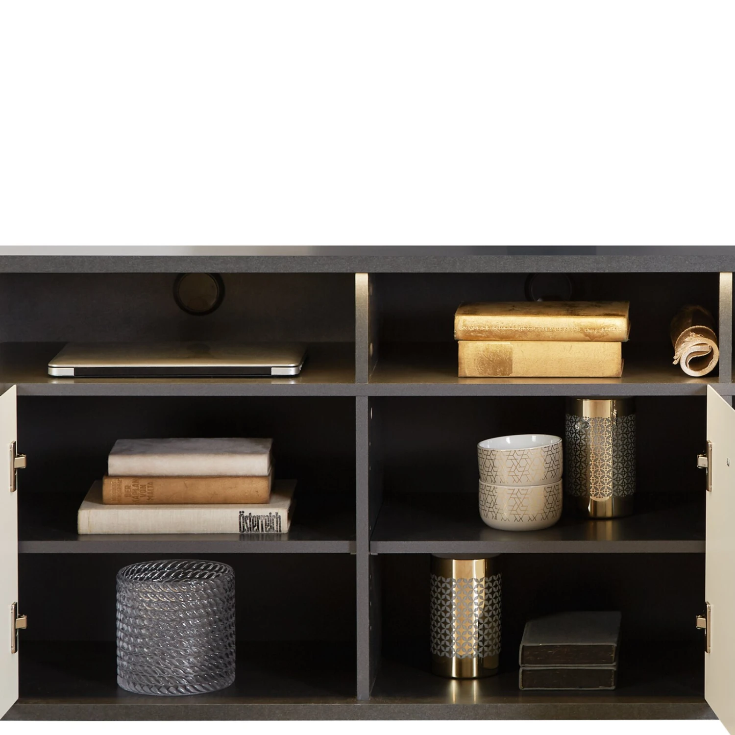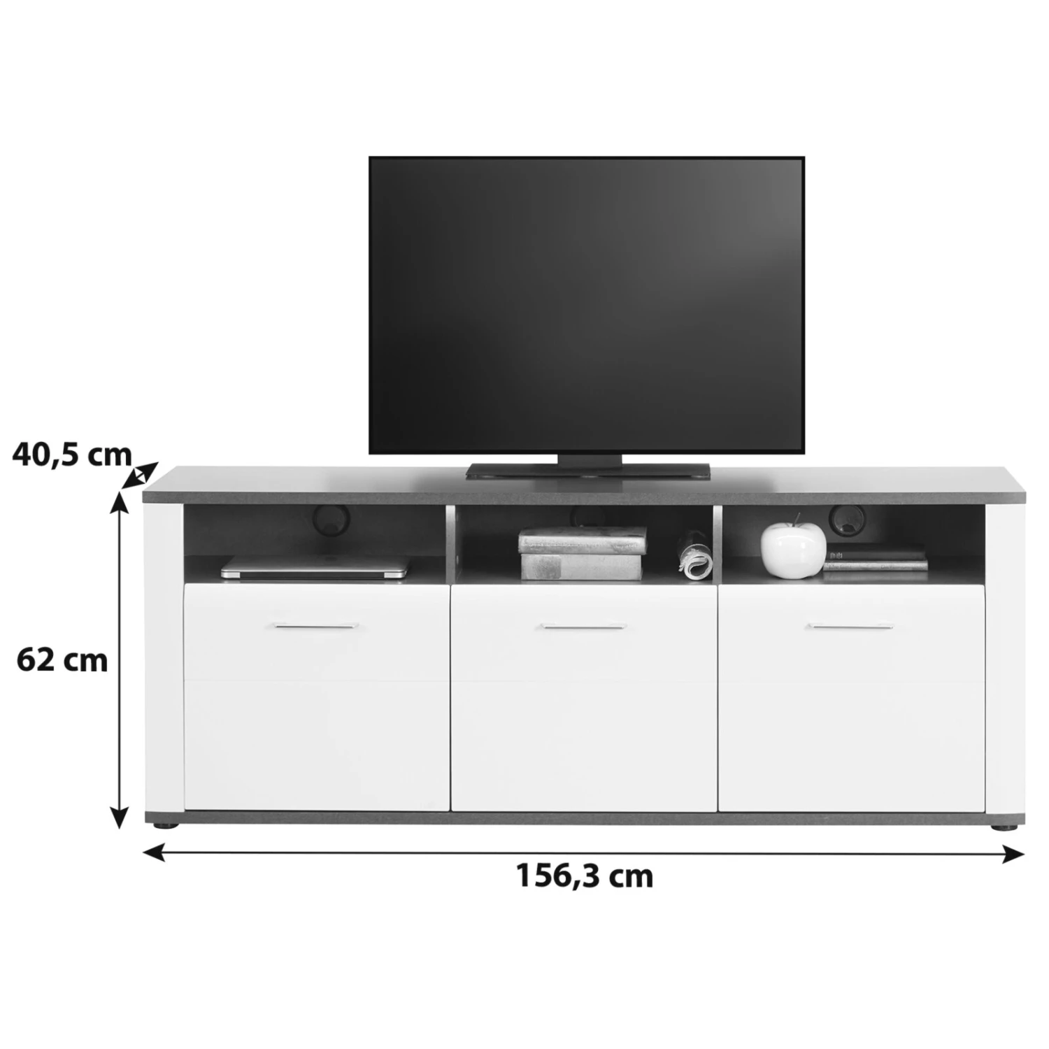 Das TV-Lowboard ALASSIO erstrahlt im hellen Weiß, das ausgezeichnet durch den Absatz in Matera Dunkel ergänzt wird. In den drei offenen Fächern haben Sie ausreichend Platz zum Abstellen Ihrer Receiver oder beispielsweise einer Spielkonsole. Durch einen Kabelkanal können Sie die Kabel direkt zum Fernseher führen. Im Inneren des Schrankes haben Sie die Möglichkeit das zu lagern, was Sie gerne in Griffnähe haben, aber doch lieber hinter einer Tür verstauen wollen. Komfortable Extras sind die chromfarbenen Metallgriffe sowie die angenehme Türdämpfung.