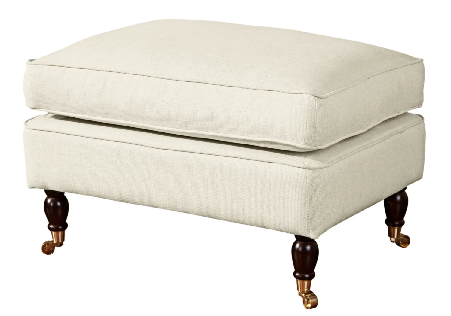 Auf vier Füßen mit dekorativen Klavierrollen steht dieser Hocker. Die Rollen sind an gedrechselten Holzfüße aus Buche Massivholz befestigt, die in dunklem Nussbaum gehalten sind. Der Bezug in Creme ist ein Flachgewebe in Leinenoptik, das sich angenehm anfühlt. Die Sitzhöhe ist ca. 48 cm, so dass er als zusätzlicher Sitzplatz angeboten werden kann. Natürlich eignet er sich auch als Tisch für ein Tablett oder zum Beine hochlegen.