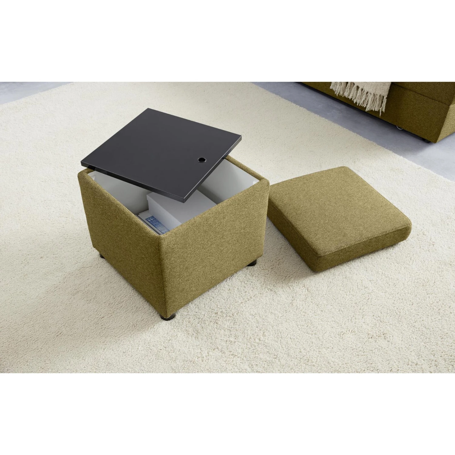 Dieser gemütliche Polsterhocker ist ein wahres Multitalent für Ihr Wohnzimmer. Die Boxspringfederung sorgt für einen hervorragenden Sitzkomfort. Der Hocker verfügt über ein Staufach, das sich eignet, um kleine Utensilien zu verstauen. Mit wenigen Handgriffen können Sie den Hocker zudem in einen Tisch verwandeln.