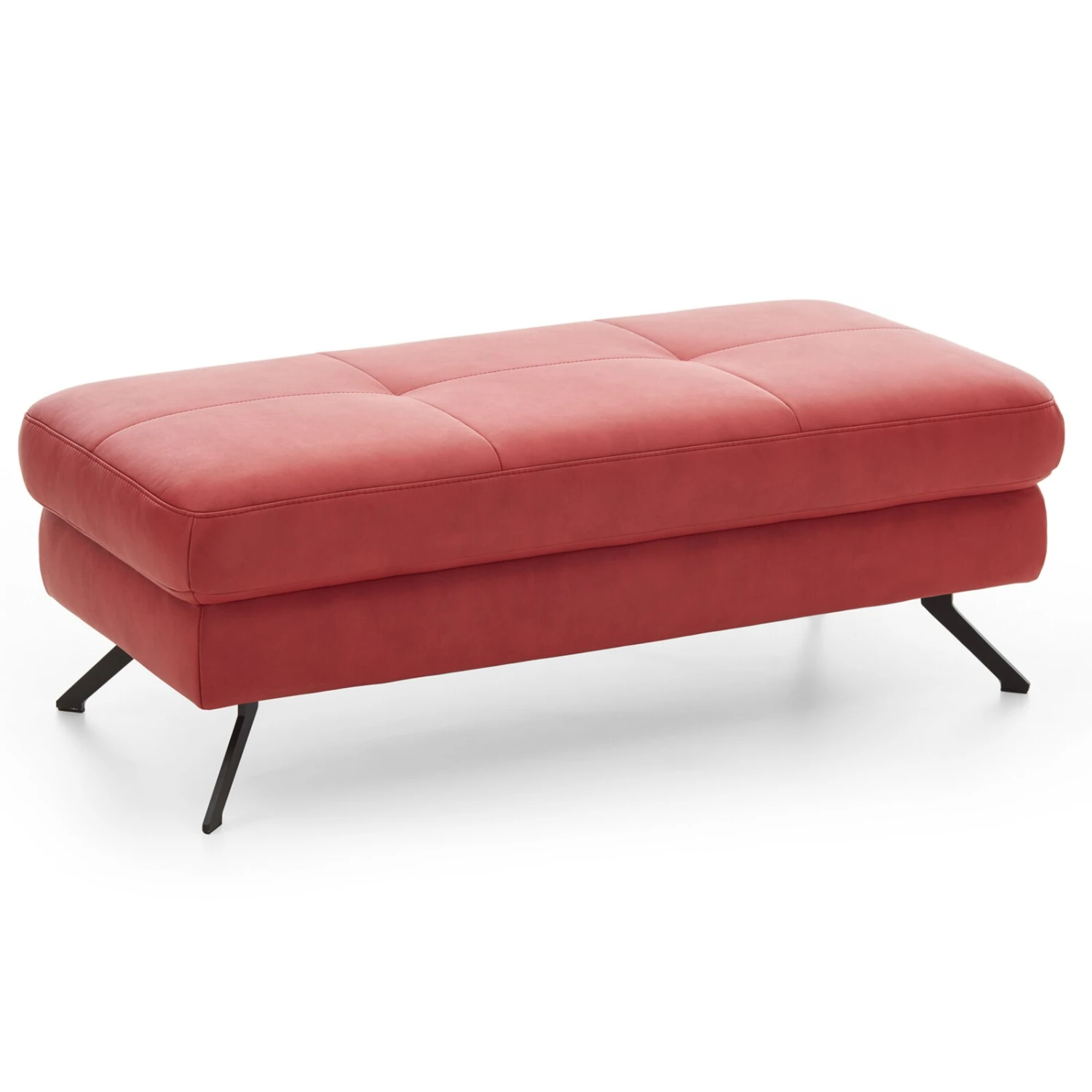 Passend zu Ihrer Wohnlandschaft gesellt sich dieser rechteckige XXL-Hocker Rot als praktische und stylische Erweiterung hinzu. Der Hocker ist mit veganem Leder aus 100% Microfaser bezogen. Auf einer Sitzhöhe von etwa 45 cm können Sie nach Belieben Platz nehmen, für einen hohen Komfort sorgt die Kaltschaumpolsterung. Schwarze Metallfüße runden das Designangebot gekonnt ab.