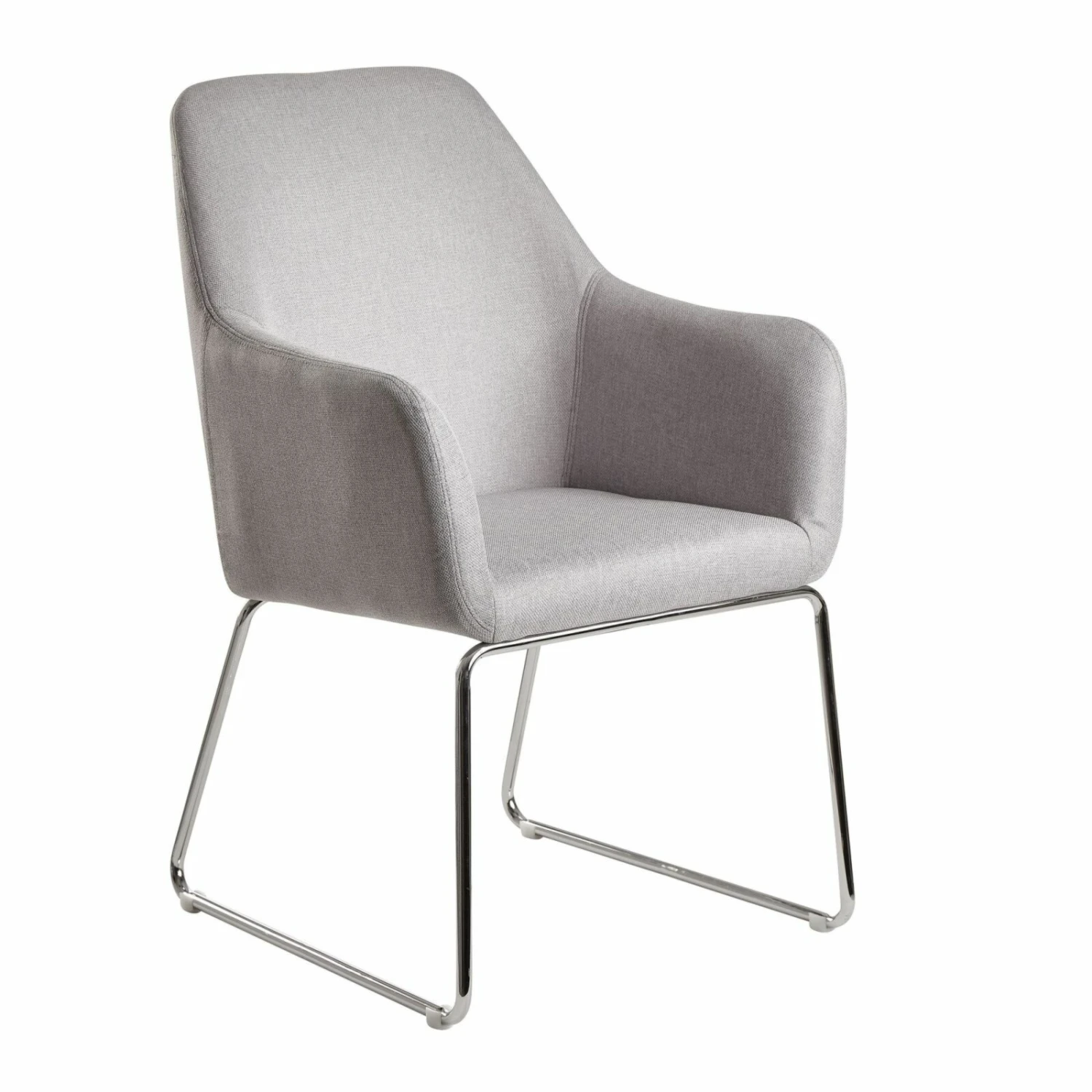 Der Polsterstuhl überzeugt nicht nur duch sein luxuriöses Design sondern auch mit hohem Komfort. Auf dem üppig gepolstertem Esszimmerstuhl mit seinen Armlehnen sitzen Sie gemütlich. Für einen besonderen Hinguckereffekt sorgt der hellgraue Samtbezug in Kombination mit den silbernfarbenen Stuhlbeinen. Die Kunststoffkappen am Fußbein verhindern das Quietschen und Verkratzen des Bodens.