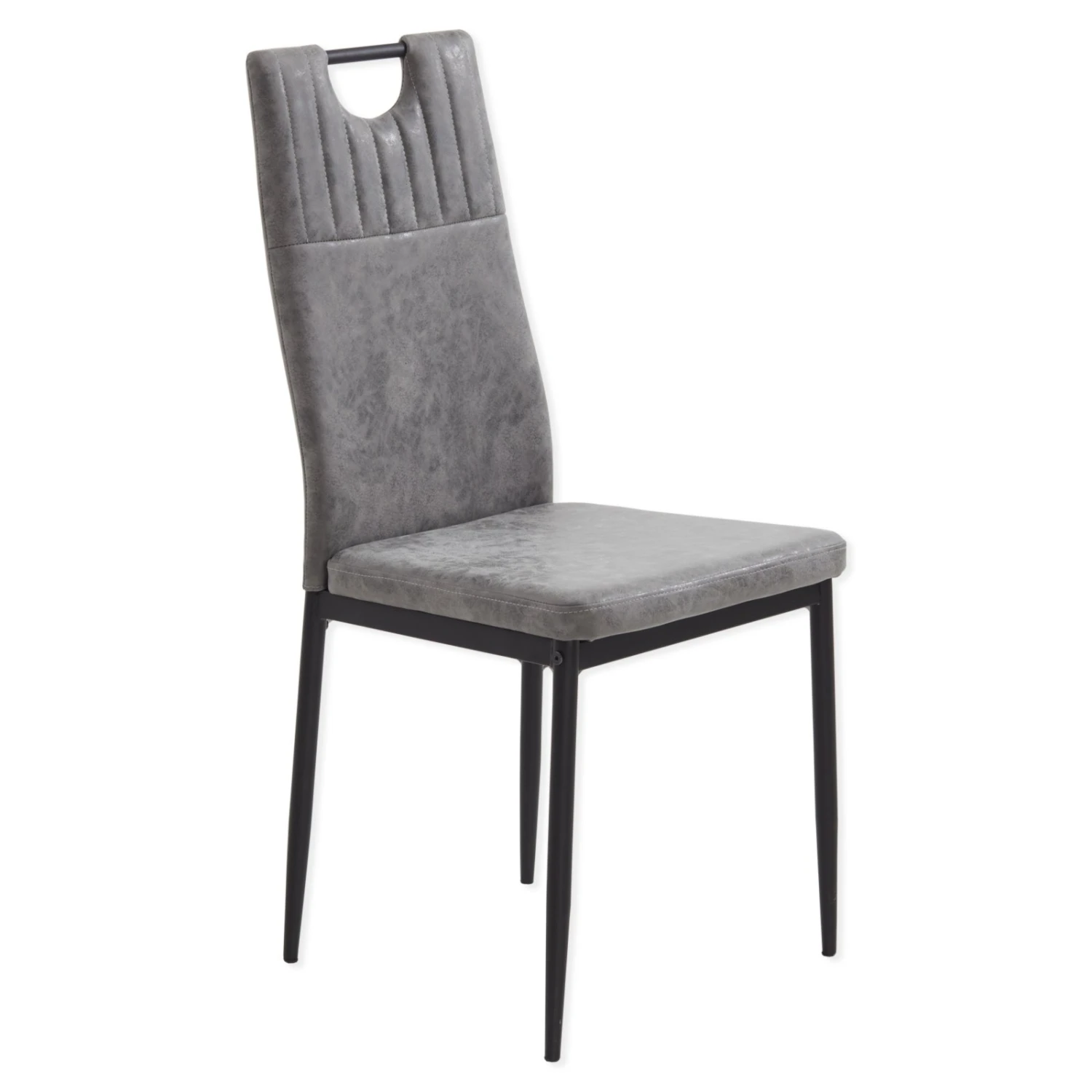 Mit dem eleganten Polsterstuhl erhält ihr Esstisch einen bequemen und wunderschönen Polsterstuhl. Rückenlehne und Sitzfläche sind mit einem grauen Bezug in Lederoptik bezogen. Das Metallgestell in der Farbe Schwarz sorgt neben einem tollen farblichen Kontrast für die nötige Stabilität. Dank des Eingriffs in der Rückenlehne lässt sich der Stuhl einfach hervorziehen.