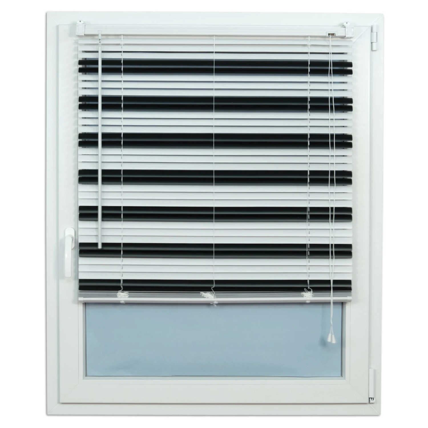 Die Jalousie ist durch die Farbgebung in Schwarz und Weiß ein Hingucker an Ihrem Fenster. Die Lamellen sind ca. 25 mm breit und können mit Hilfe einer Stange im Neigungsgrad verändert werden. So können Sie den Lichteinfall individuell bestimmen. Natürlich kann es auch hochgezogen werden, so dass das Fenster ganz frei liegt.