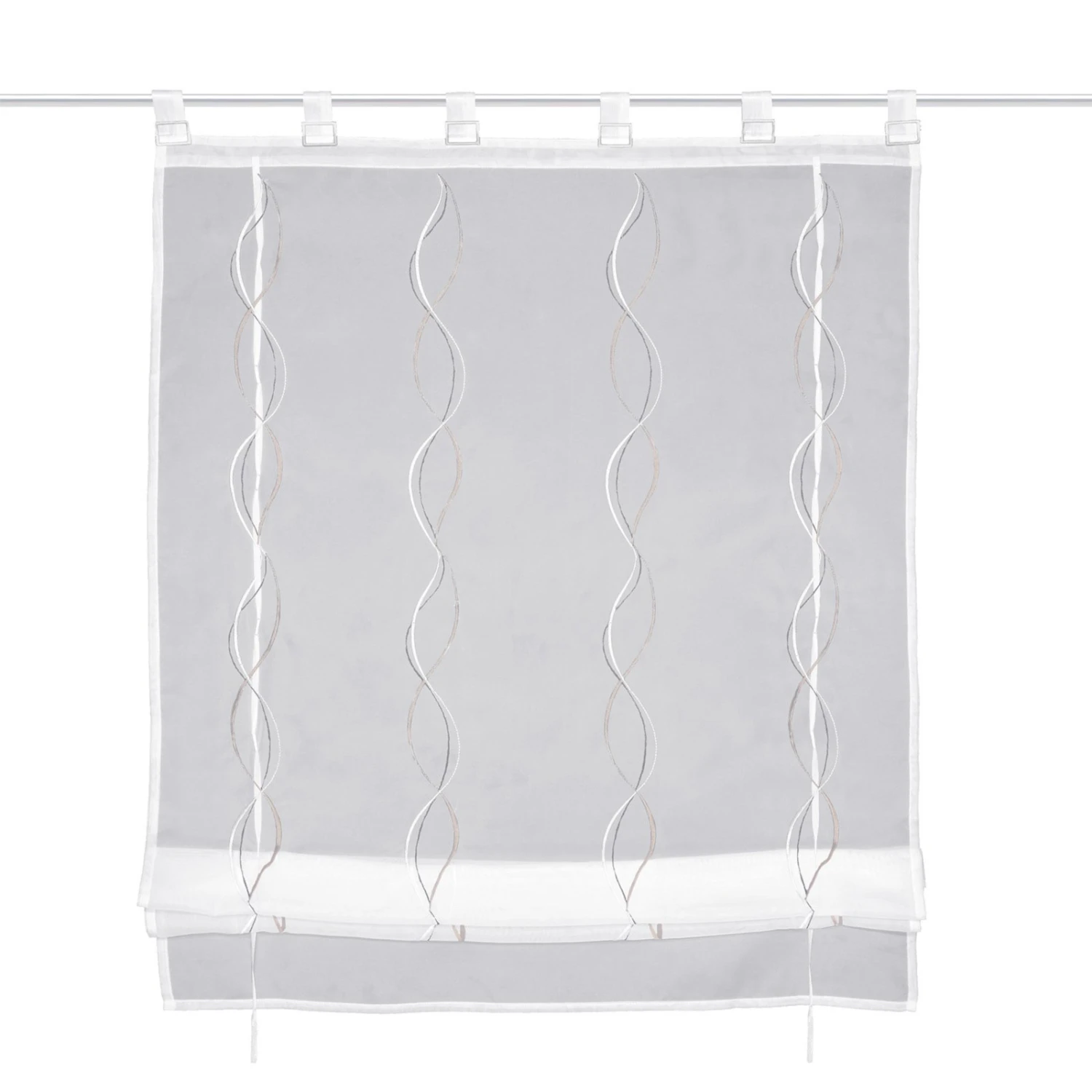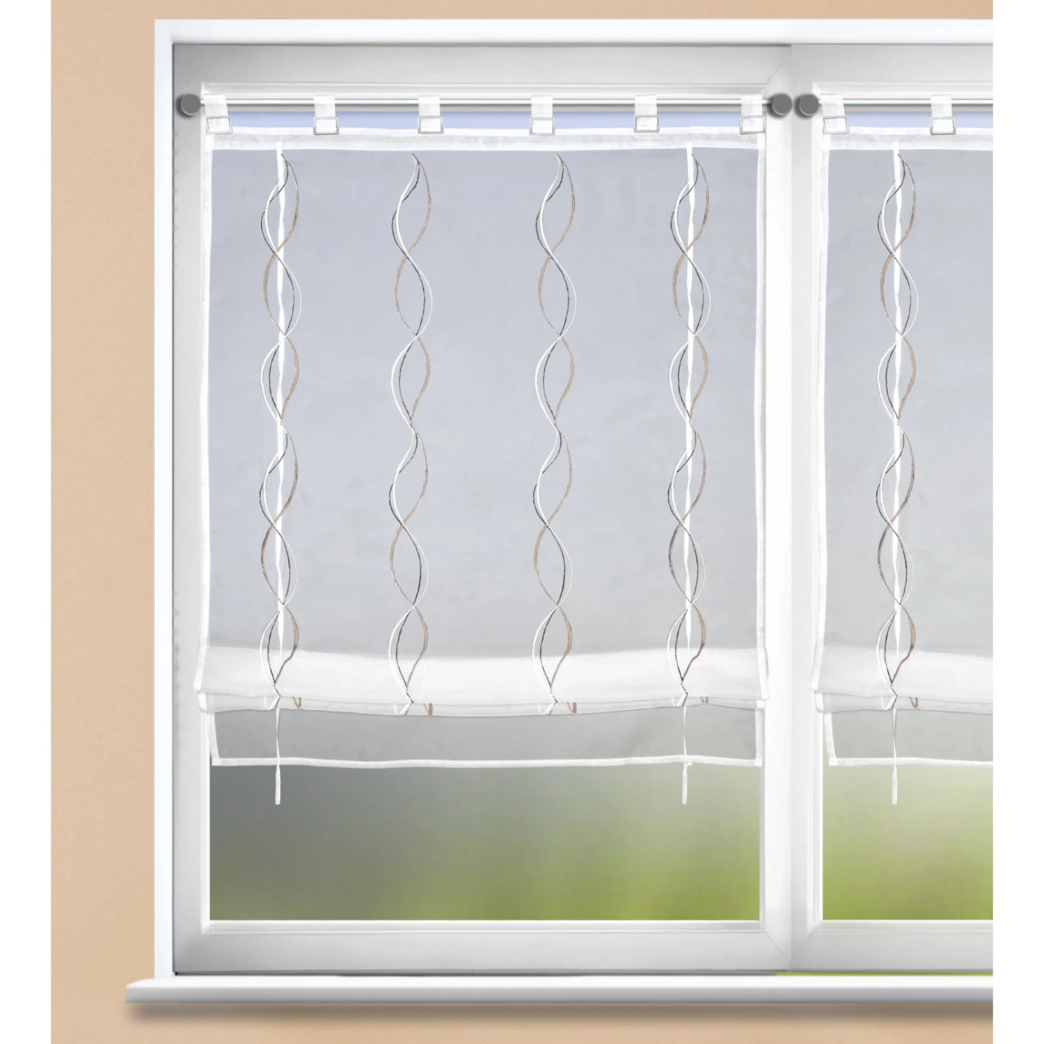 Dieses Raffrollo überzeugt mit seinem weiß-taupefarbenen Muster und der schönen Schlaufendekoration. Durch die leichte und dezente Optik lässt es sich in jedes Wohnambiente wunderbar integrieren.