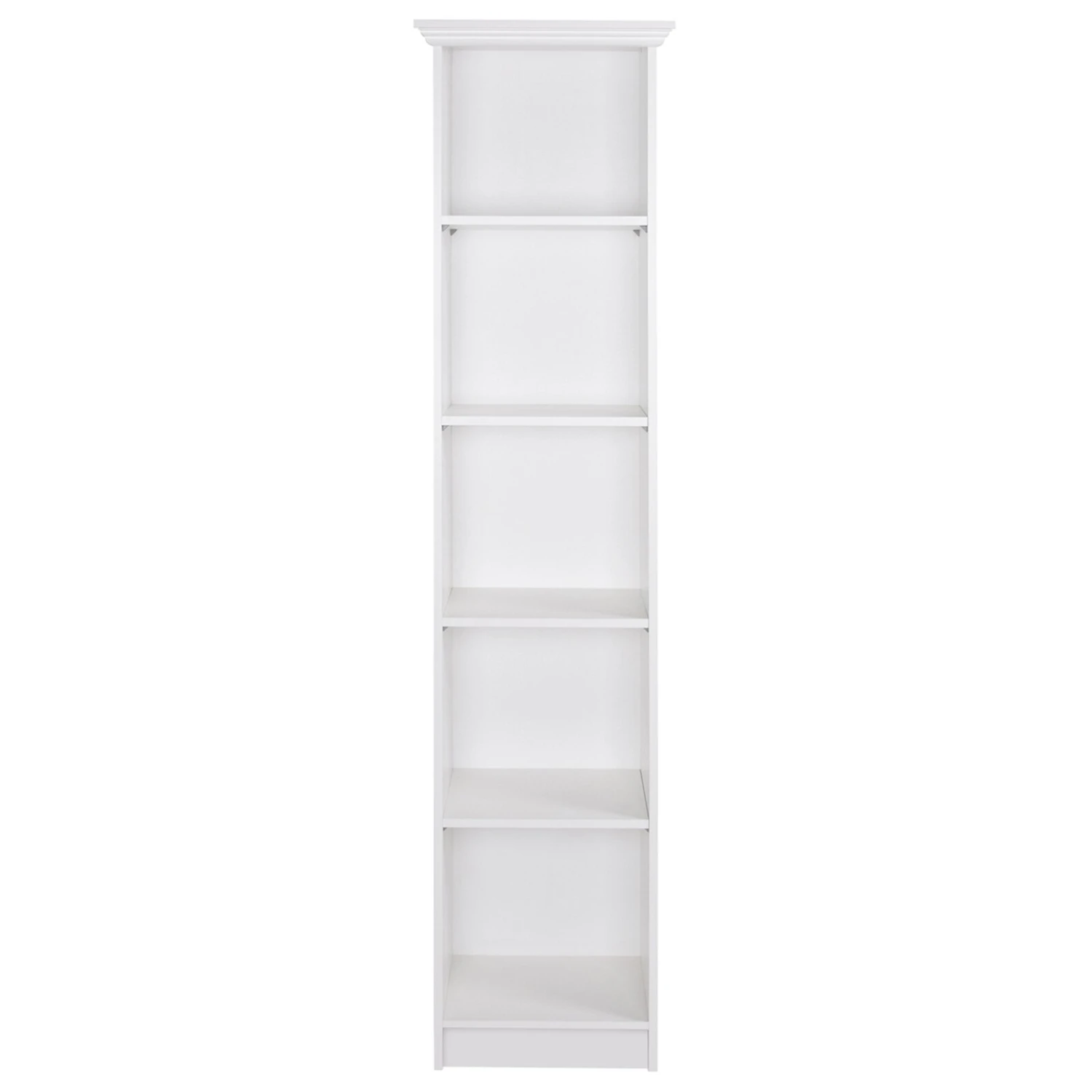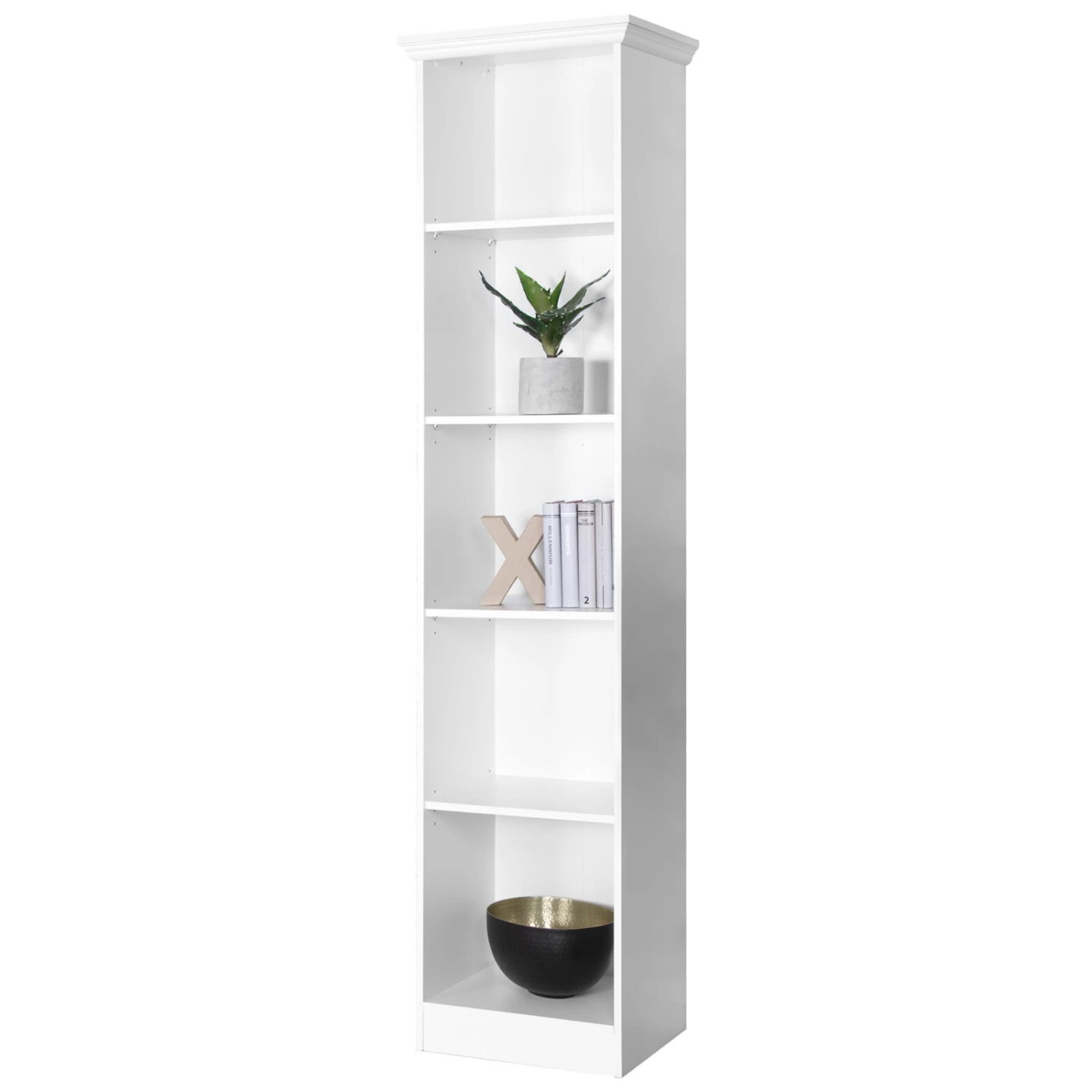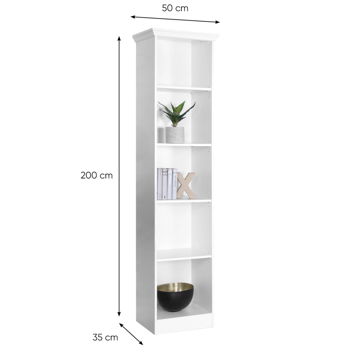 Mit insgesamt fünf offenen Fächer aus vier Einlegeböden bietet dieses Regal reichlich Platz für Ordner, Bücher, Deko-Artikel und Spielzeug. Das umlaufende Zierprofil setzt Akzente und unterstreicht den typischen Landhaus-Stil.