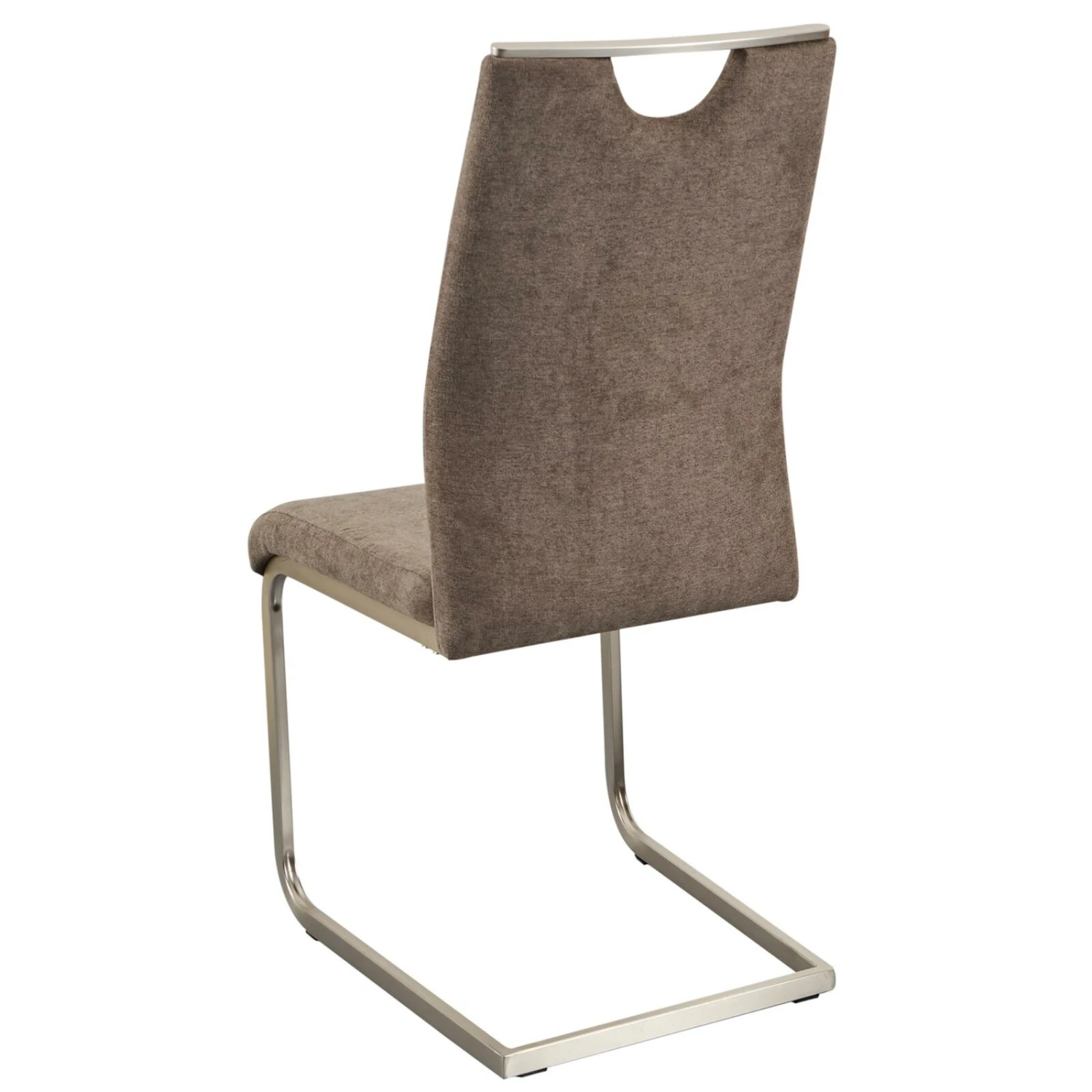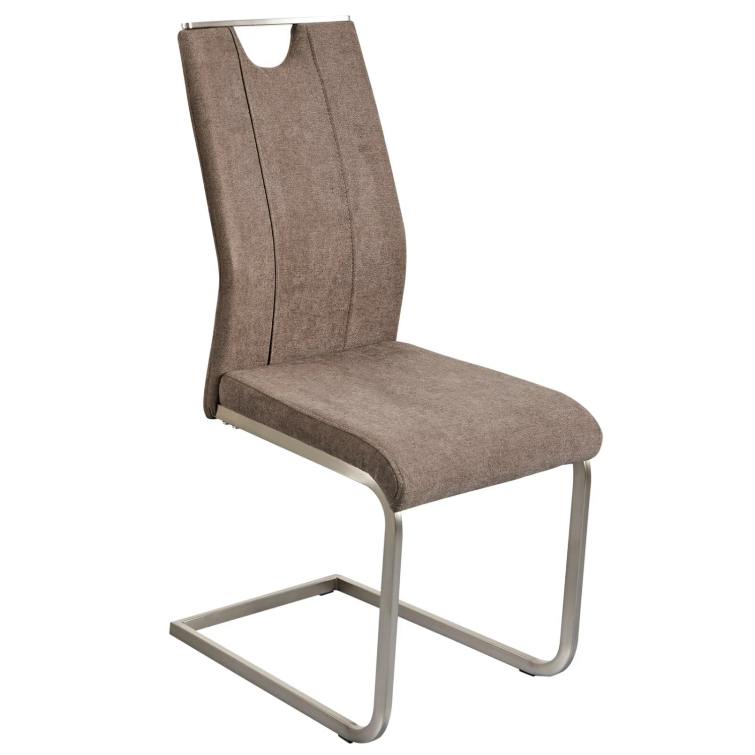 Schicker Schwingstuhl in grau-brauner Farbgebung, die besonders gut mit vielen verschiedenen Esszimmerstilen kombiniert werden kann. Der Bezug aus weicher Microfaser harmoniert sehr gut mit dem Gestell in Edelstahloptik. Der Stuhl verfügt über einen Griff an der Rückenlehne, der sowohl praktisch ist als auch ein optisches Highlight darstellt.