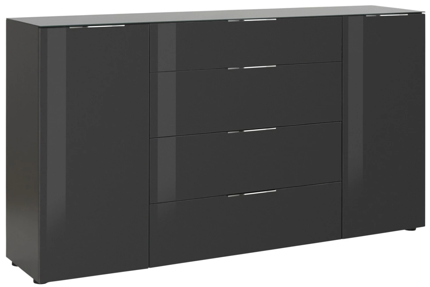Mit zwei Türen und insgesamt vier Schubkästen sorgt dieses Sideboard für reichlich Stauraummöglichkeiten. Hier können Sie einige Ihrer Gebrauchsgegenstände unterbringen. Hinter den beiden Türen, die mit einer praktischen Dämpfung ausgestattet sind, befinden sich je zwei Einlegeböden, die den Innenraum perfekt aufteilen. In den vier Schubkästen, die ebenfalls gedämpft sind, können Sie kleinere Utensilien verstauen. Der anthrazit lackierte Glasaufsatz verleiht dem Sideboard eine stilvolle Optik, die von den chromfarbenen Griffleisten stimmig abgerundet wird.