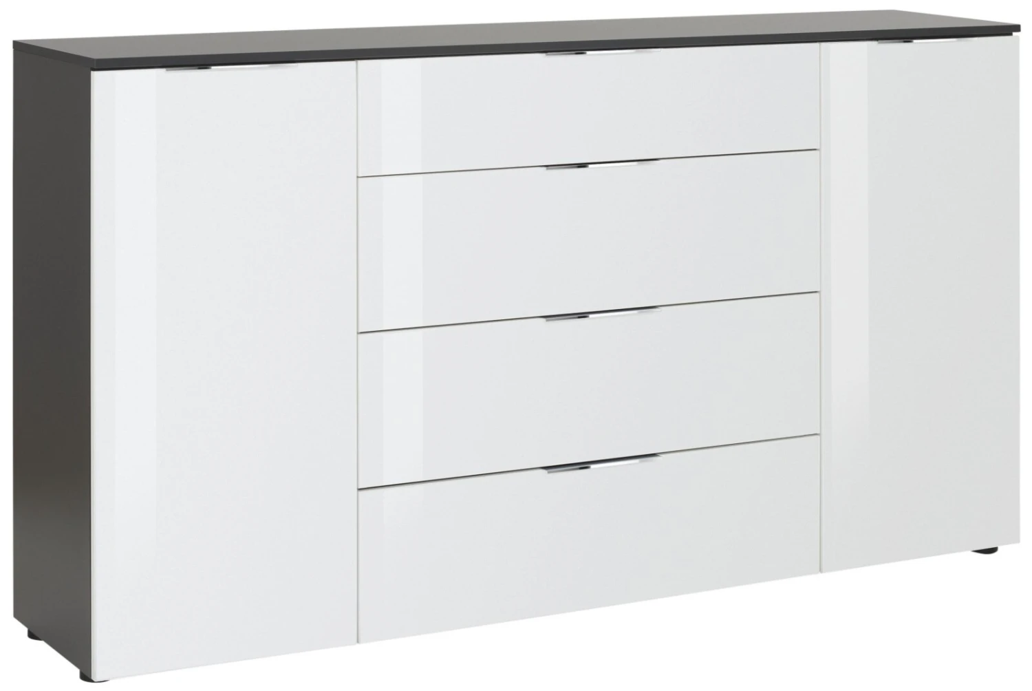 Dieses Sideboard mit zwei Türen und vier Schubkästen bietet genügend Stauraum für viele Ihrer Gegenstände. Die Türen sowie die Schubkästen sind gedämpft und sehen mit der weißen Glasfront äußerst modern aus. Der matte anthrazitfarbige Korpus, die chromfarbigen Griffleisten sowie der anthrazit lackierte Glasaufsatz untermalen das elegante Design.