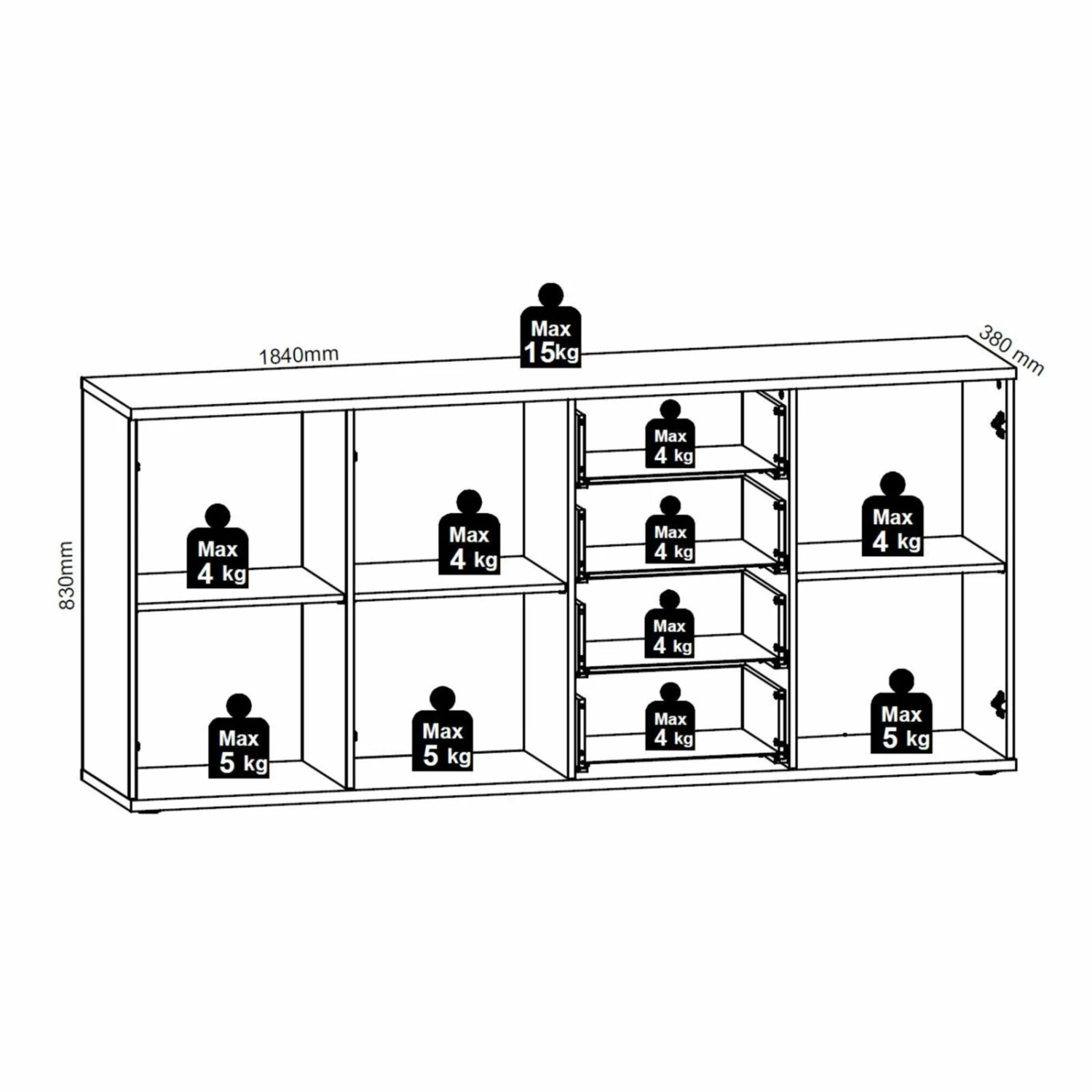 Das Sideboard in der Bartex Eiche Nachbildung und in Grau sorgt wegen der drei Türen und vier Schubkästen für ausgiebige Stauraummöglichkeiten deiner Utensilien. Das Sideboard ist etwa 185 cm breit, 83 cm hoch und 38 cm tief.