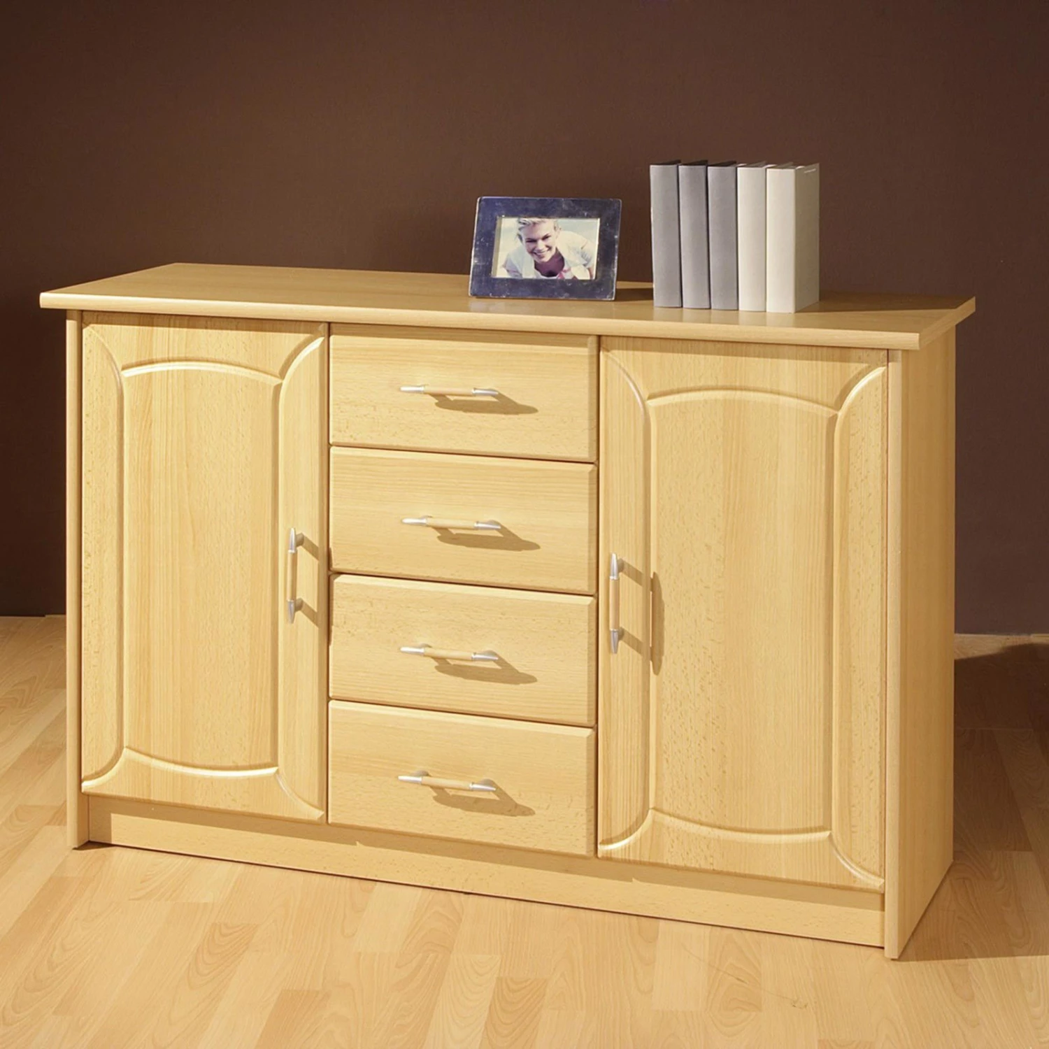 In zeitloser Buche Nachbildung präsentiert sich diese etwa 125 Zentimeter breite Kommode, die für reichlich Stauraummöglichkeiten sorgen wird. Diese finden Sie in vier Schubkästen und hinter zwei Türen, deren Innenräume von je einem Einlegeböden praktisch aufgeteilt werden.