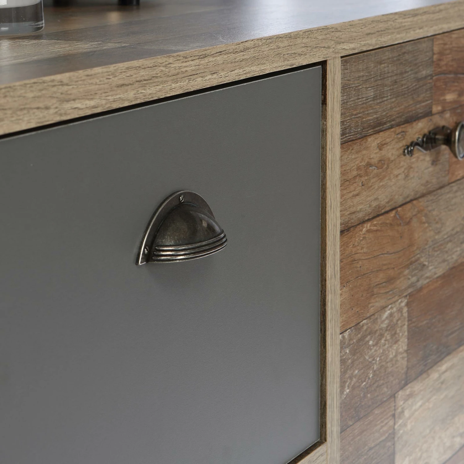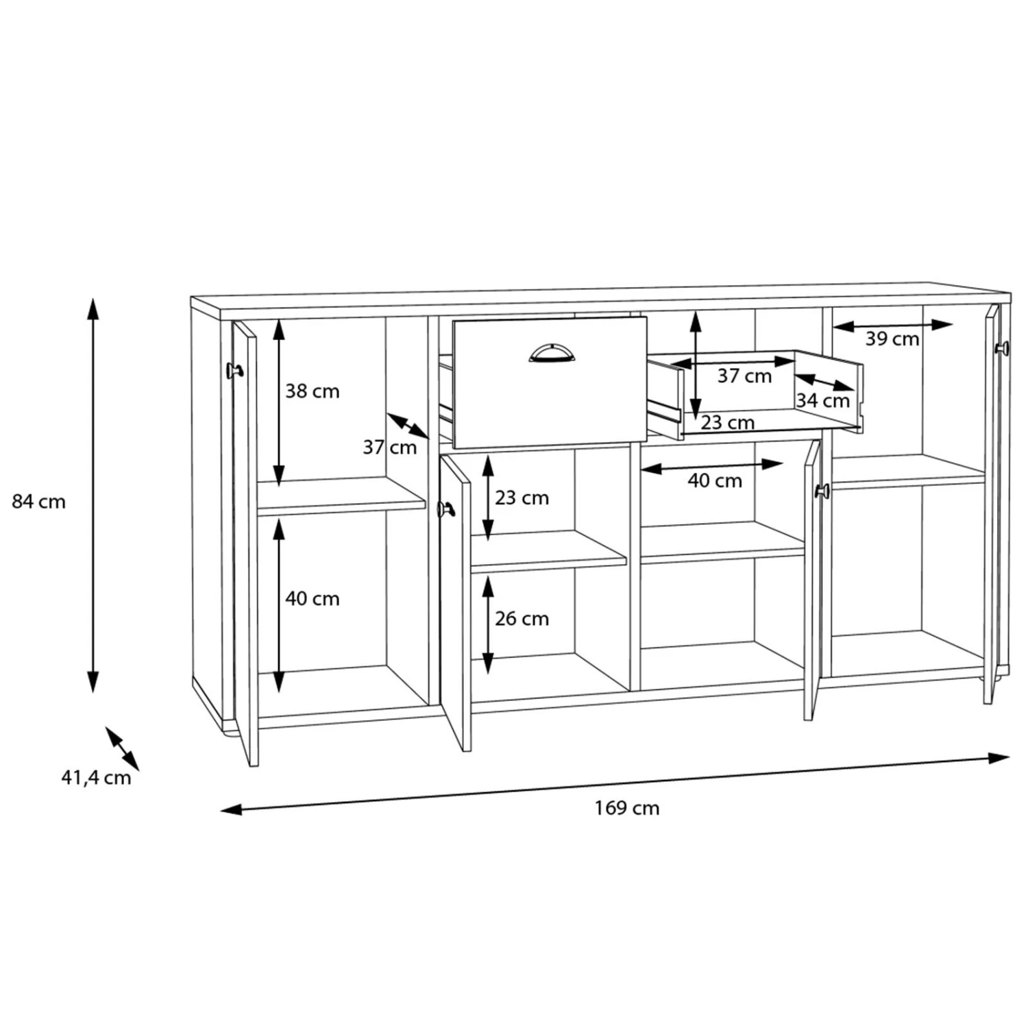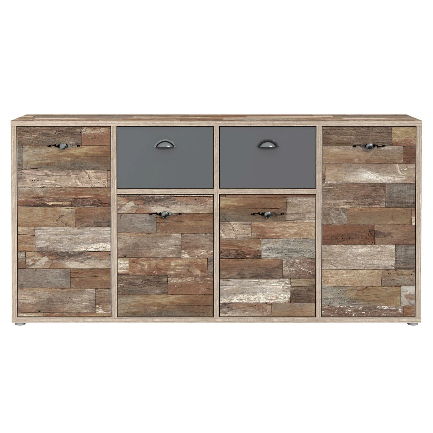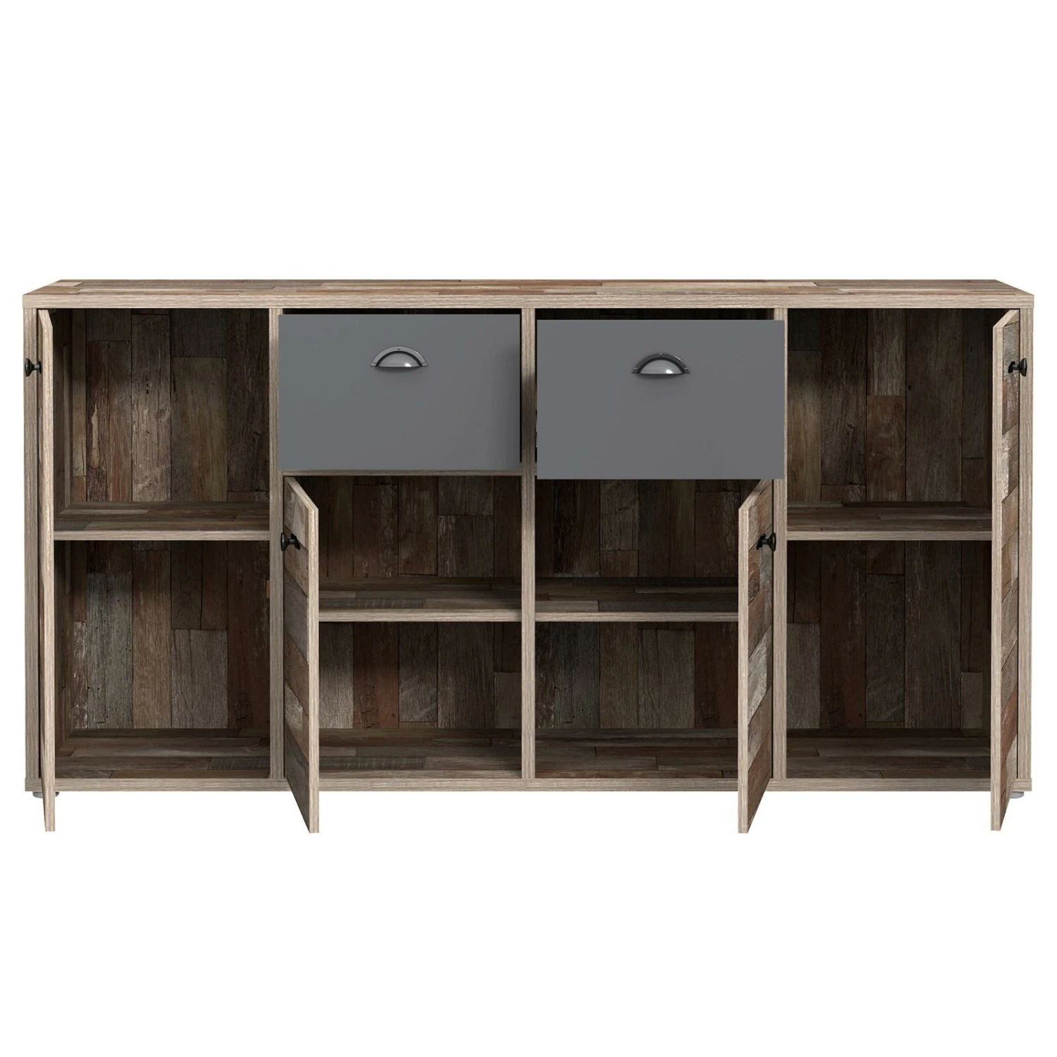 Für viel Stauraum sorgt dieses etwa 169 Zentimeter breite Sideboard in eindrucksvoller Maringo Pinie Nachbildung. Die beiden Schubkästen setzen sich in einem matten Grau ab und setzen tolle Akzente. Hinter vier Türen können Sie neben den Schubkästen viele Utensilien und Gebrauchsgegenstände unterbringen und übersichtlich verstauen.