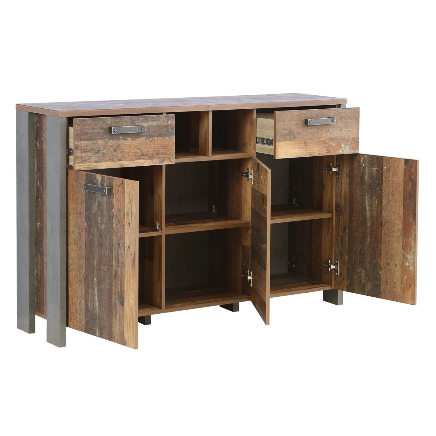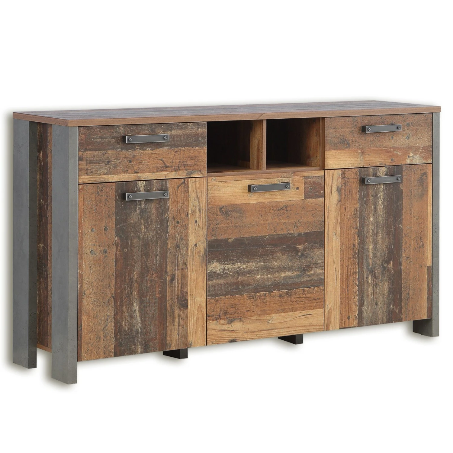 Der rustikale Look von diesem Sideboard wird in Ihren Räumlichkeiten ein warmes und wohnliches Ambiente versprühen! Die Kombination aus Holz- und Beton-Optik verleiht diesem Möbelstück ein raffiniertes Äußeres. Hinter drei Türen, in zwei Schubkästen und in zwei offenen Fächern bietet dieses Sideboard reichlich Platz zum Verstauen verschiedenster Untensilien.